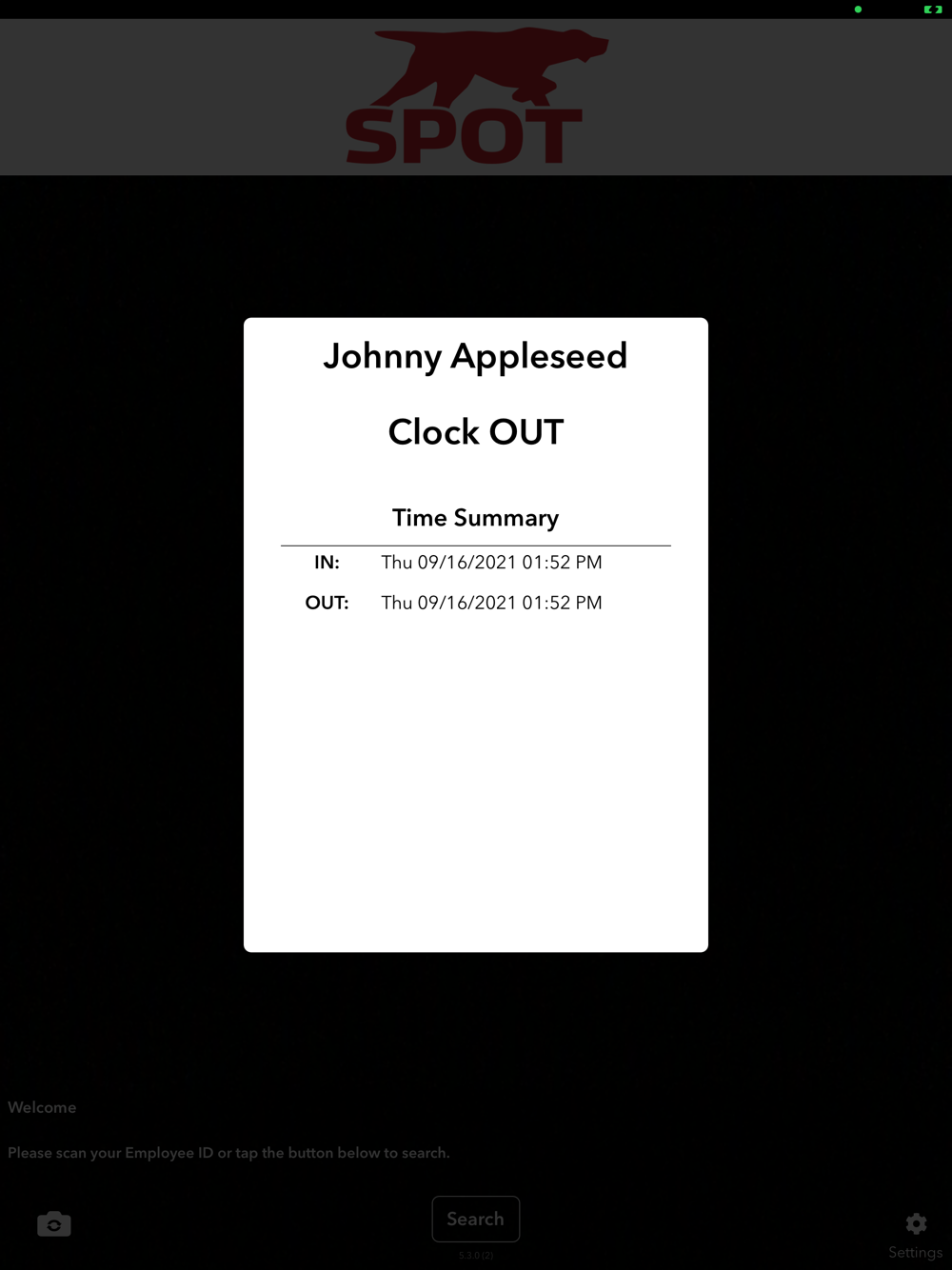 With the SPOT Time Kiosk, you can easily capture when your employees Clock In and Clock Out for the day. You can setup multiple Kiosk's near your employee entrances and scan employee IDs to register Clock In and Out.