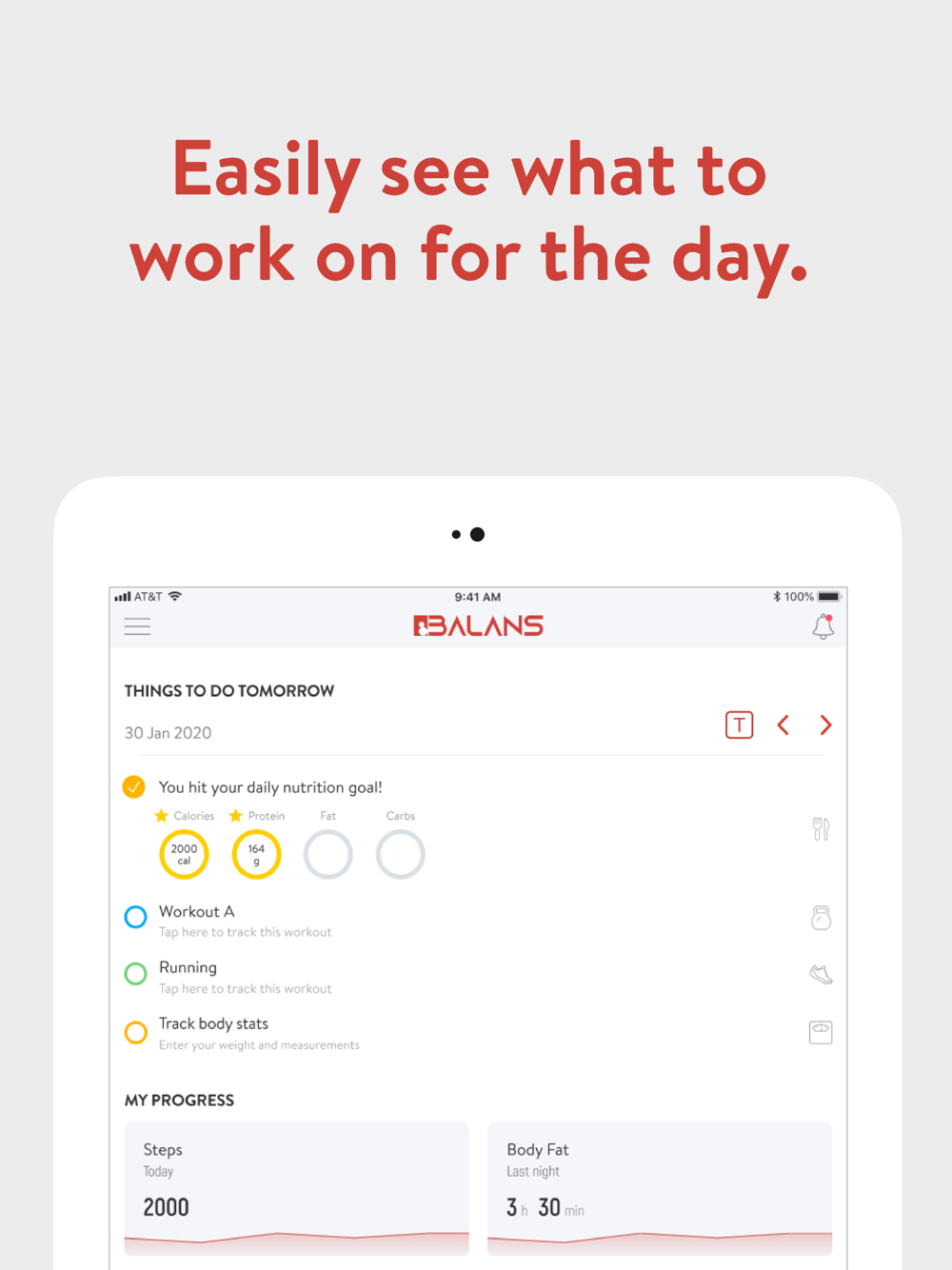 من خلال تطبيق BALANS أنت على بعد خطوة من تحقيق التوازن الغذائي والرياضي للاستمرار وتحقيق أفضل النتائج. كل ذلك بمساعدة مدربك الشخصي.