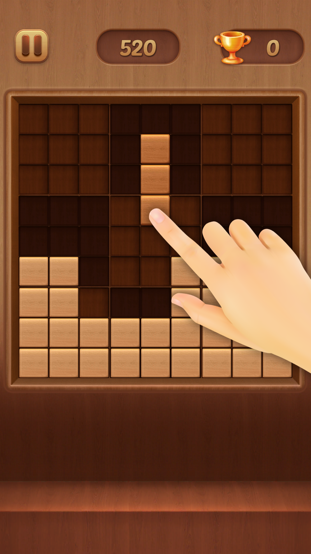 Drag and match blocks to complete both "squares" and "lines" to remove them on a 9x9 wood board.