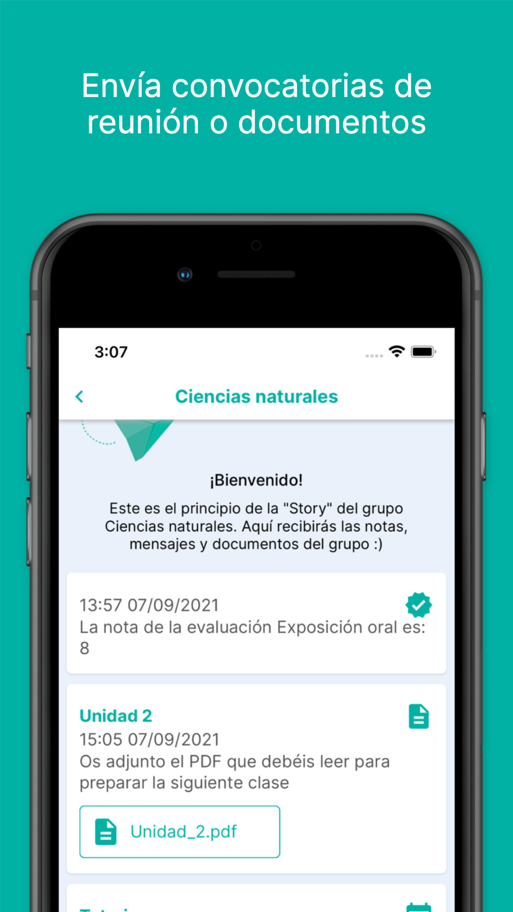Además de las stories, donde recibes un flujo de notificaciones, la aplicación también incorpora las funcionalidades de chats y los grupos. A diferencia de las stories es una mensajería bidireccional para poder realizar trabajos en grupos y facilitar el intercambio de informaciones con los alumnos y las familias.