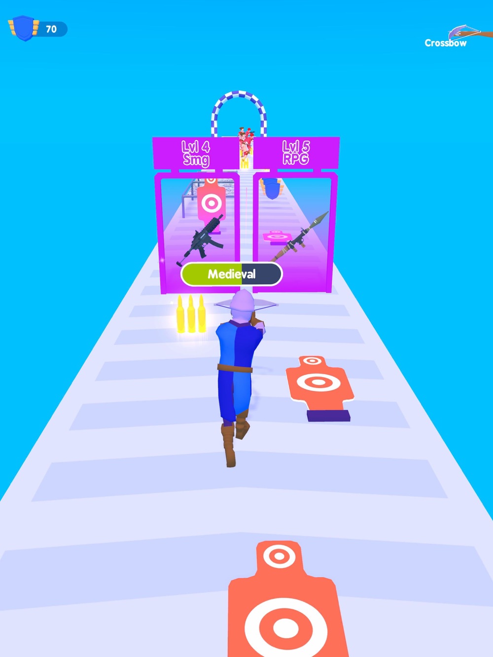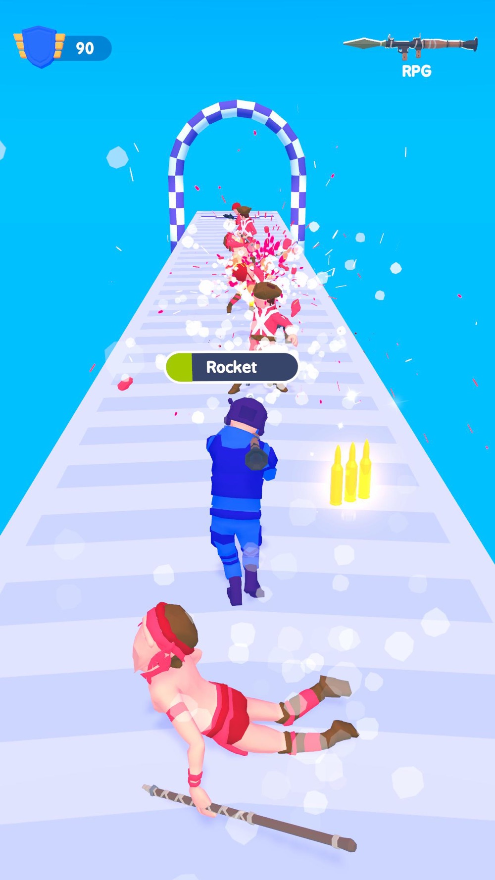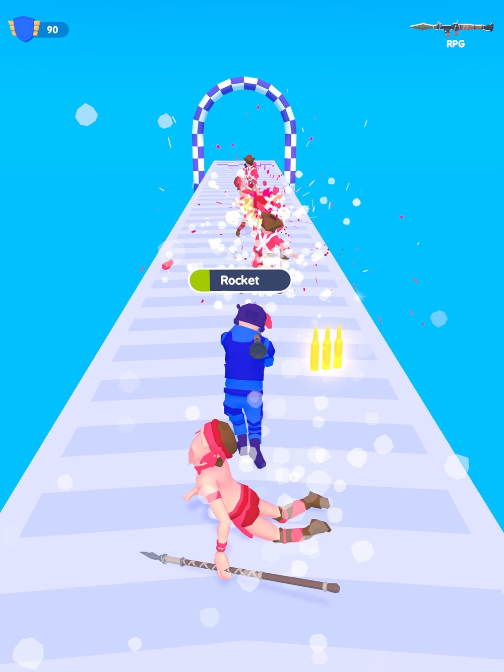 Swerve and collect ranks and pass through weapon gates to upgrade or change your warrior from pre-historic warrior times to futuristic fighter.