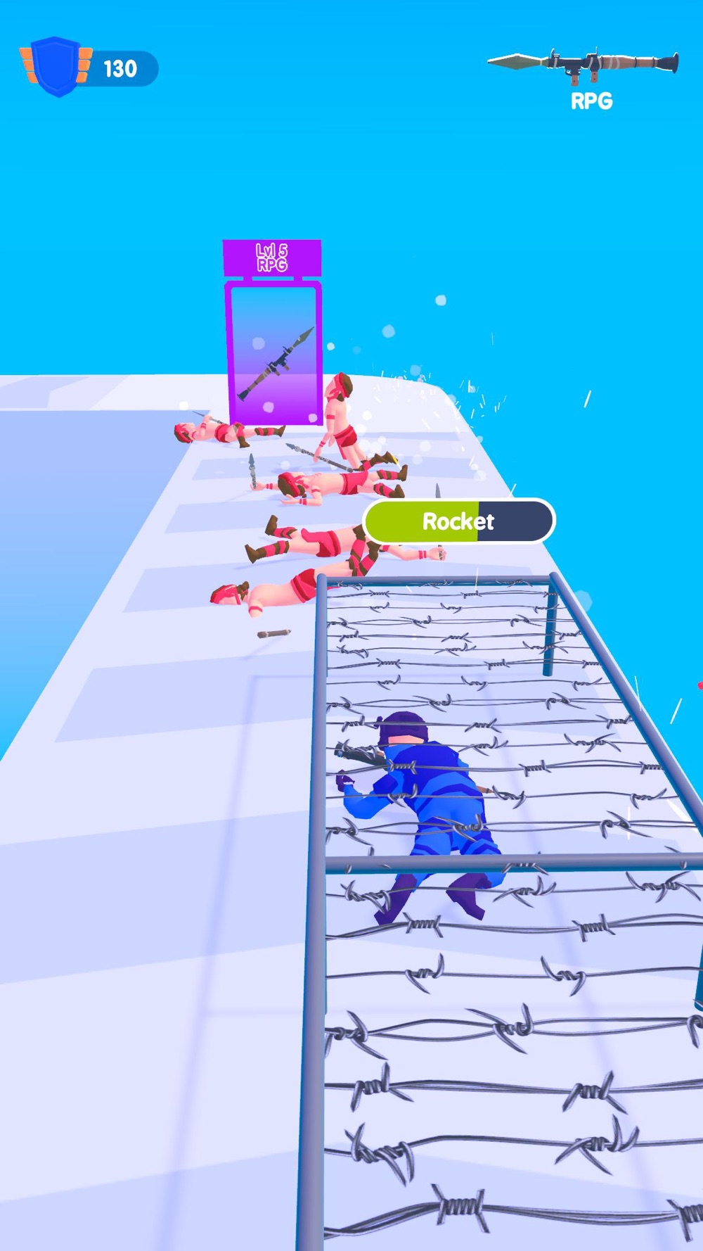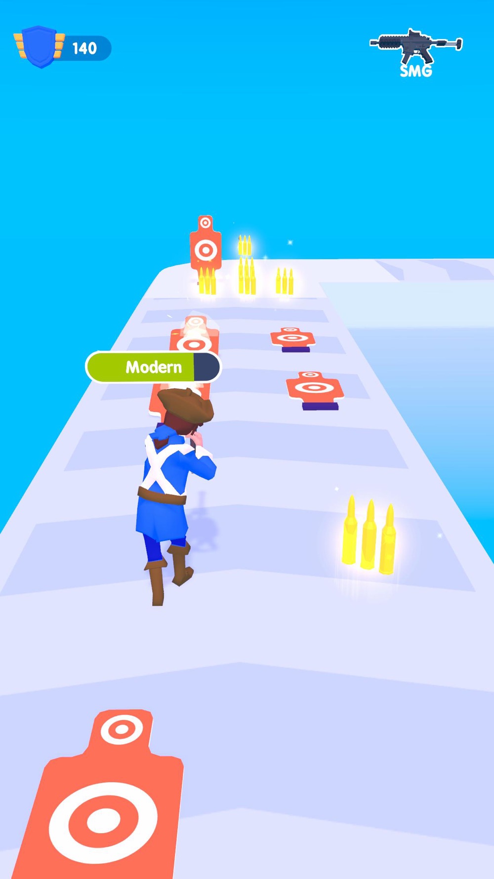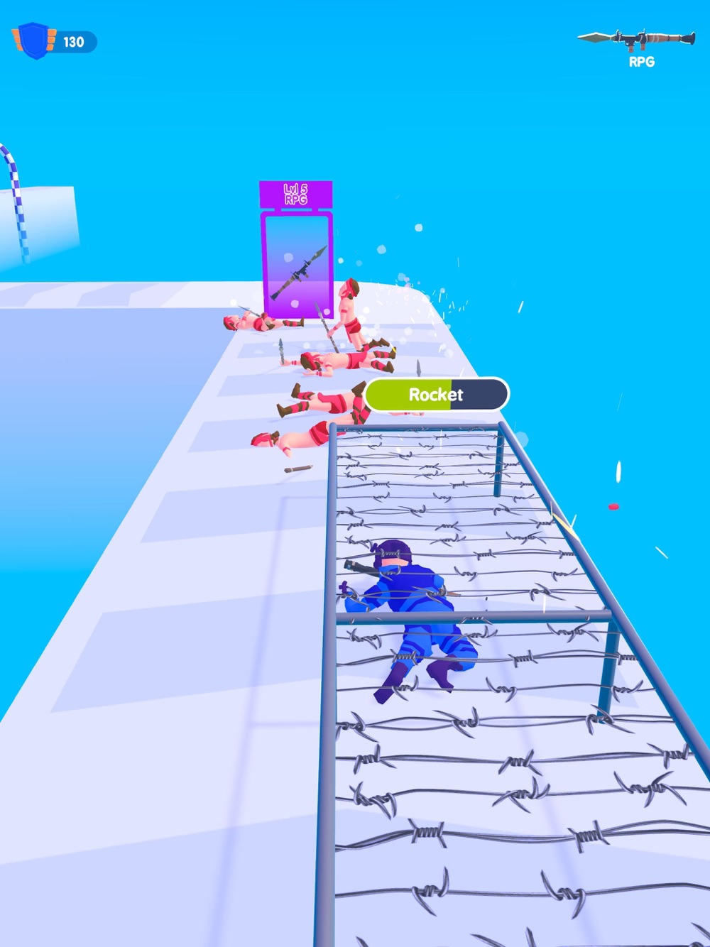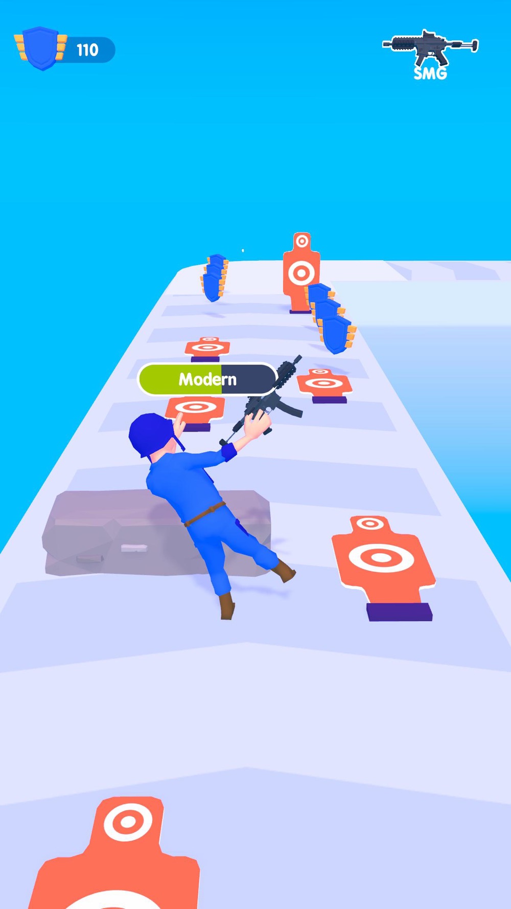 Swerve and collect ranks and pass through weapon gates to upgrade or change your warrior from pre-historic warrior times to futuristic fighter.
