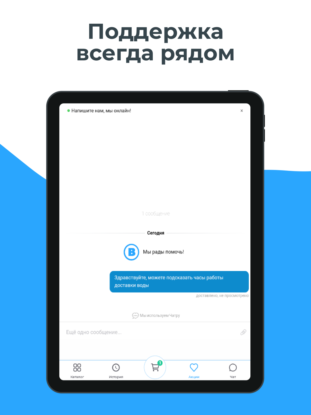 Для Вашего удобства в приложении Водаком реализованы функции истории заказов, профиля, чат-бота и др. Весь функционал приложения удобен и понятен, что делает заказ воды еще комфортнее и быстрее.