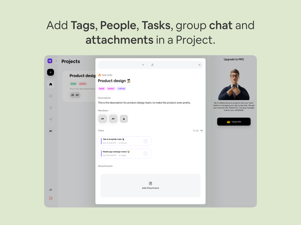 Taskbit is a convenient way to manage your collaborative projects and task with teams. You can create tasks, add members to projects and attach attachments in each project and can chat we the projects mates within the app.