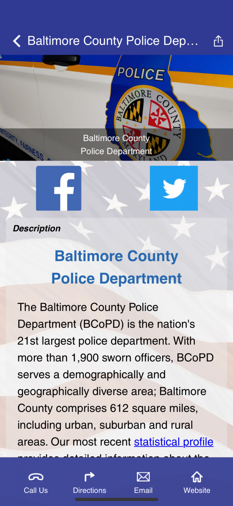 On behalf of the men and women of the Baltimore County Police Department, welcome to our app. This app is for the employees and family members of the Baltimore County Police Department and the community it serves. It contains information about our department as well as safety and crime prevention tips. Baltimore County Police Department employees and family members will have access to a full range of wellness tools.