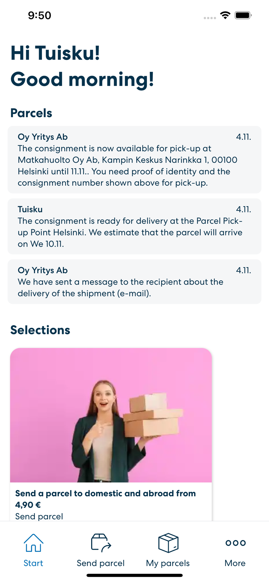 Use the app to send a parcel anywhere in Finland or even abroad. As the app retains the last address you sent a parcel to, sending parcels to your favourite address couldn’t be easier.