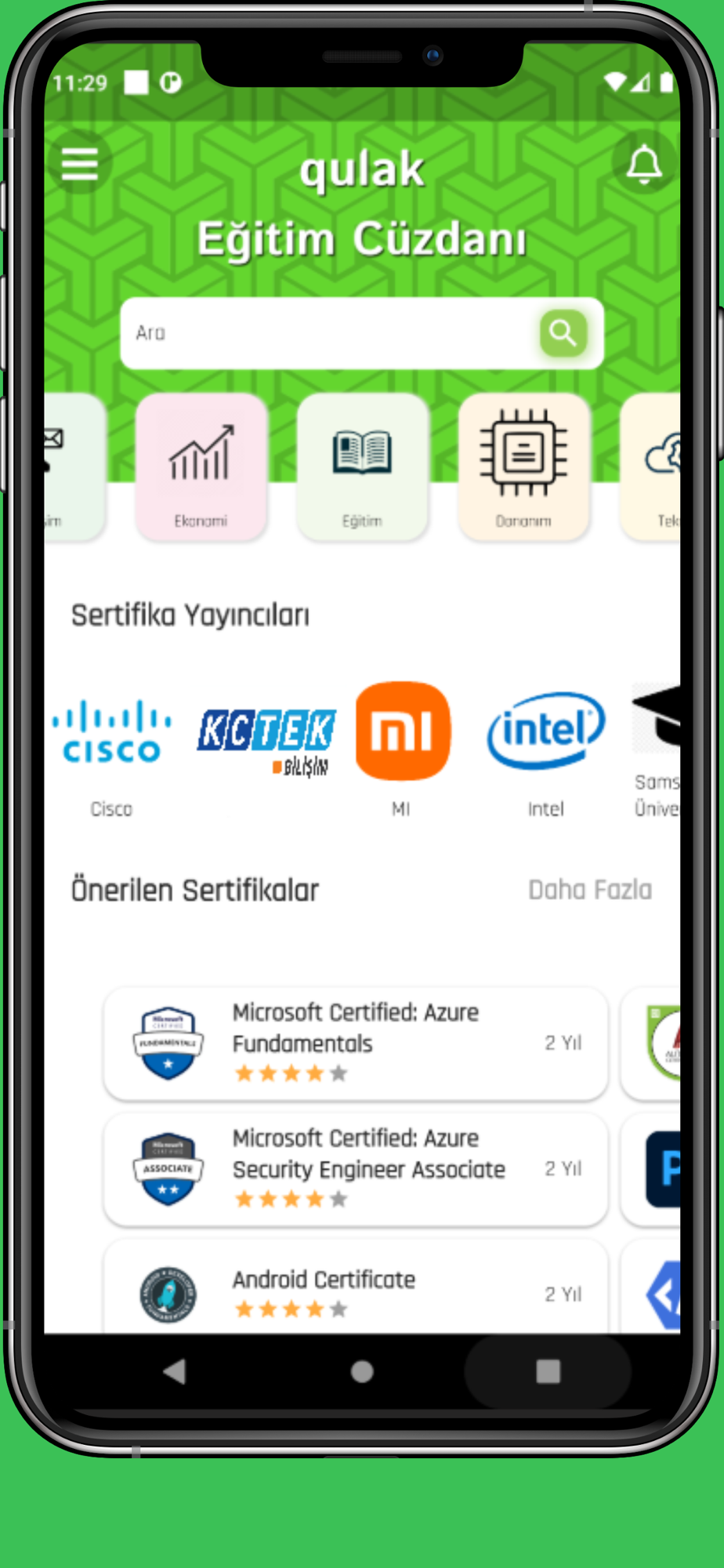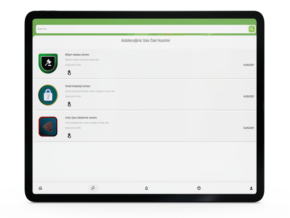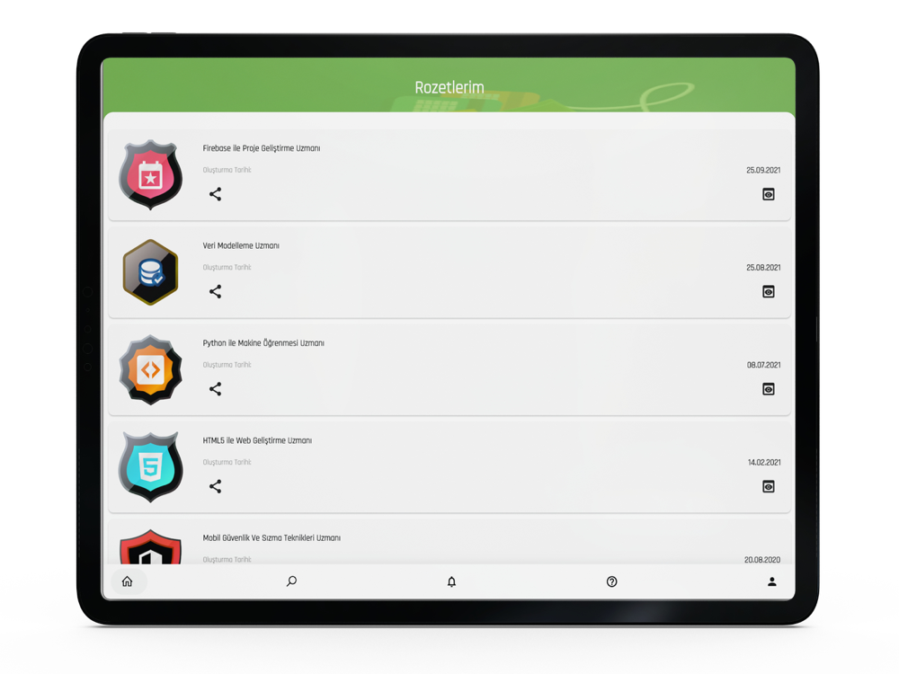 Qulak Exam kullanıcıları başarılı olduğu sınavların rozetlerini görebilir, paylaşabilir ve yeni rozetler kazanabileceği sınavlara bakabilir.