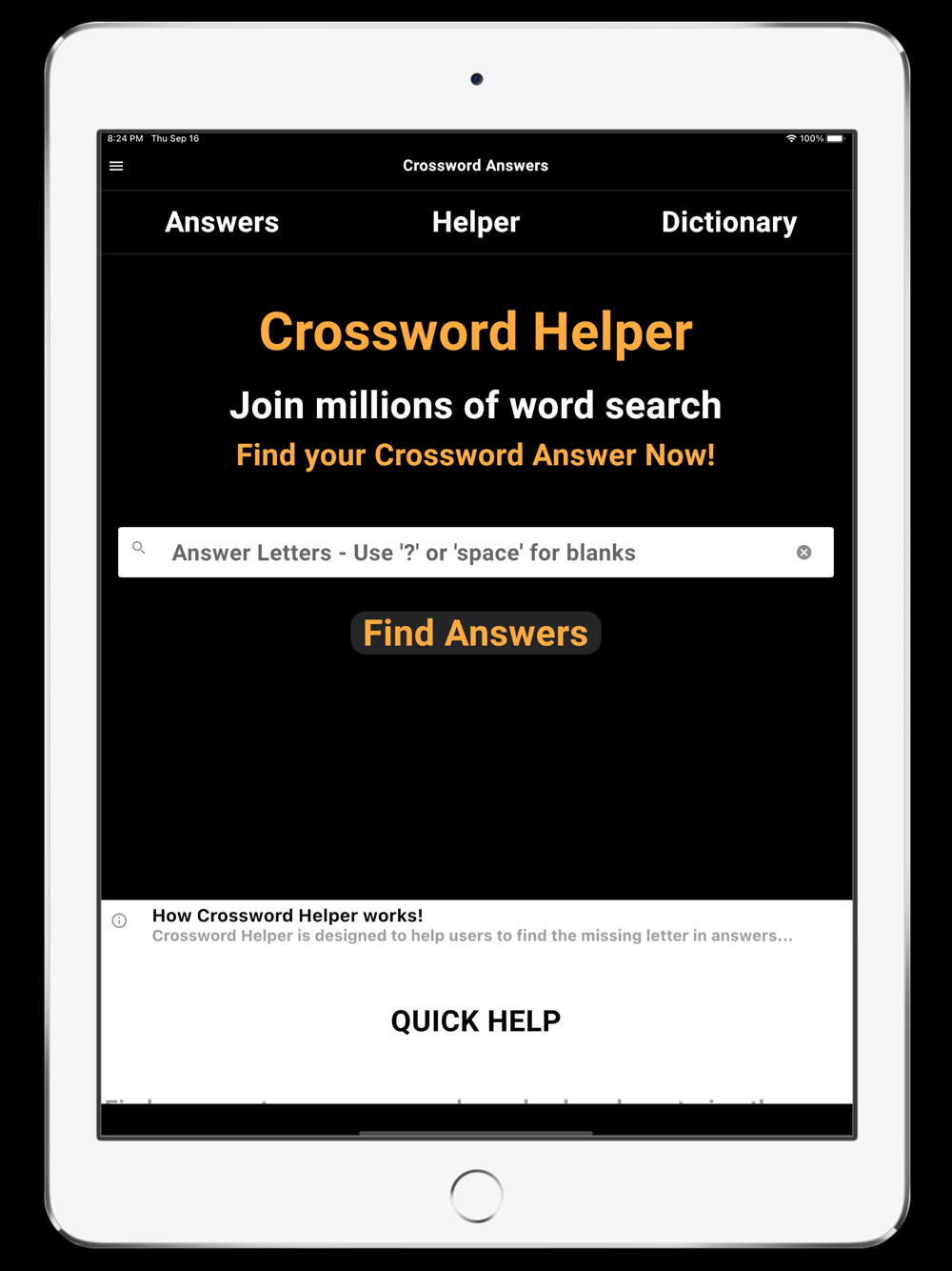 Crossword Helper is designed to help users to find the missing letter in answers...