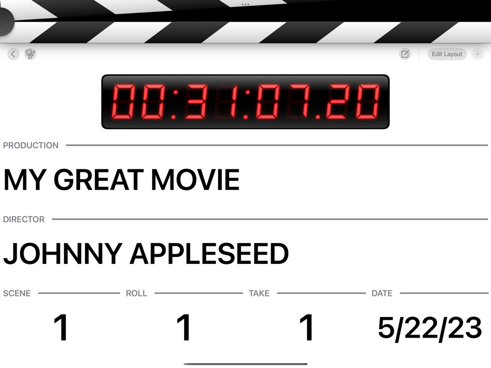 Get ready to shoot with ease in a stunning and user-friendly interface. Take One allows you to effortlessly create, type, and clap your way into action. Simply double- or triple-tap number fields to quickly increment or decrement their values. Tap the clapper once to open, and a second time to 'clap' and begin the clock timer.