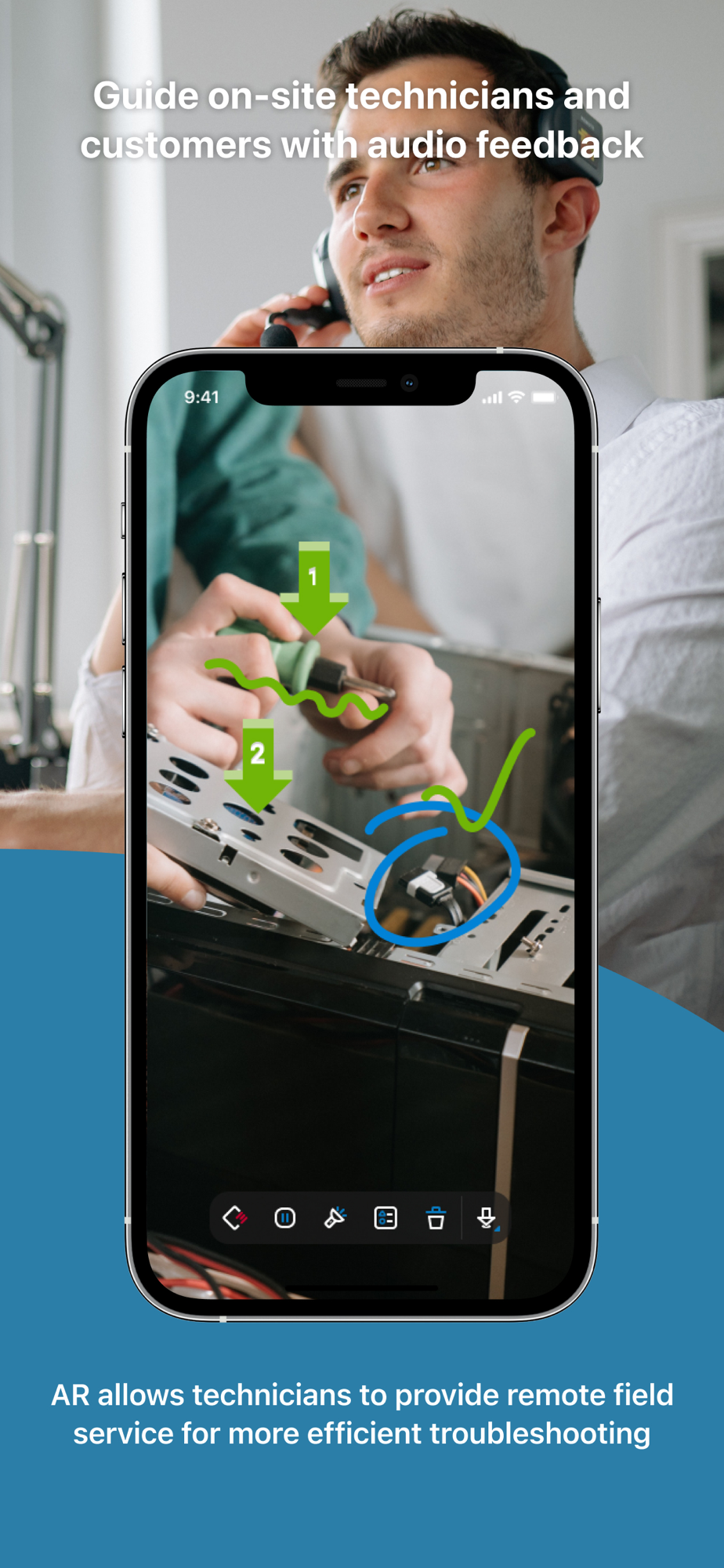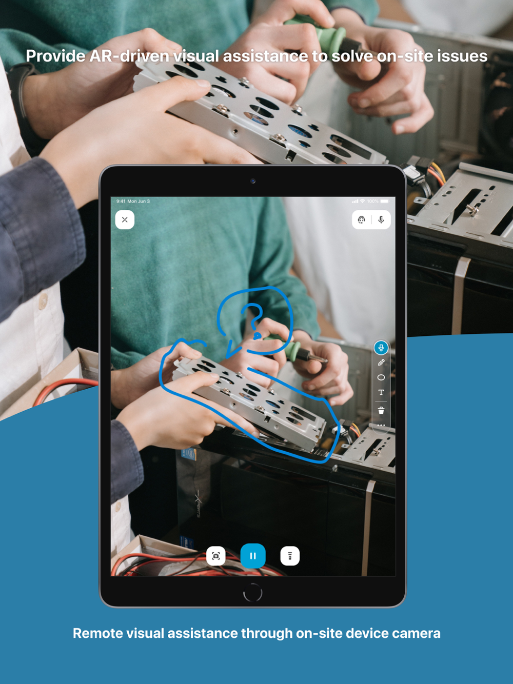 Enable your remote technician to connect to off-site locations and troubleshoot issues by easily seeing the environment as if they were there. Leverage camera sharing from your mobile device along with interactive augmented reality annotations and two-way communication to troubleshoot, guide, and resolve issues live.