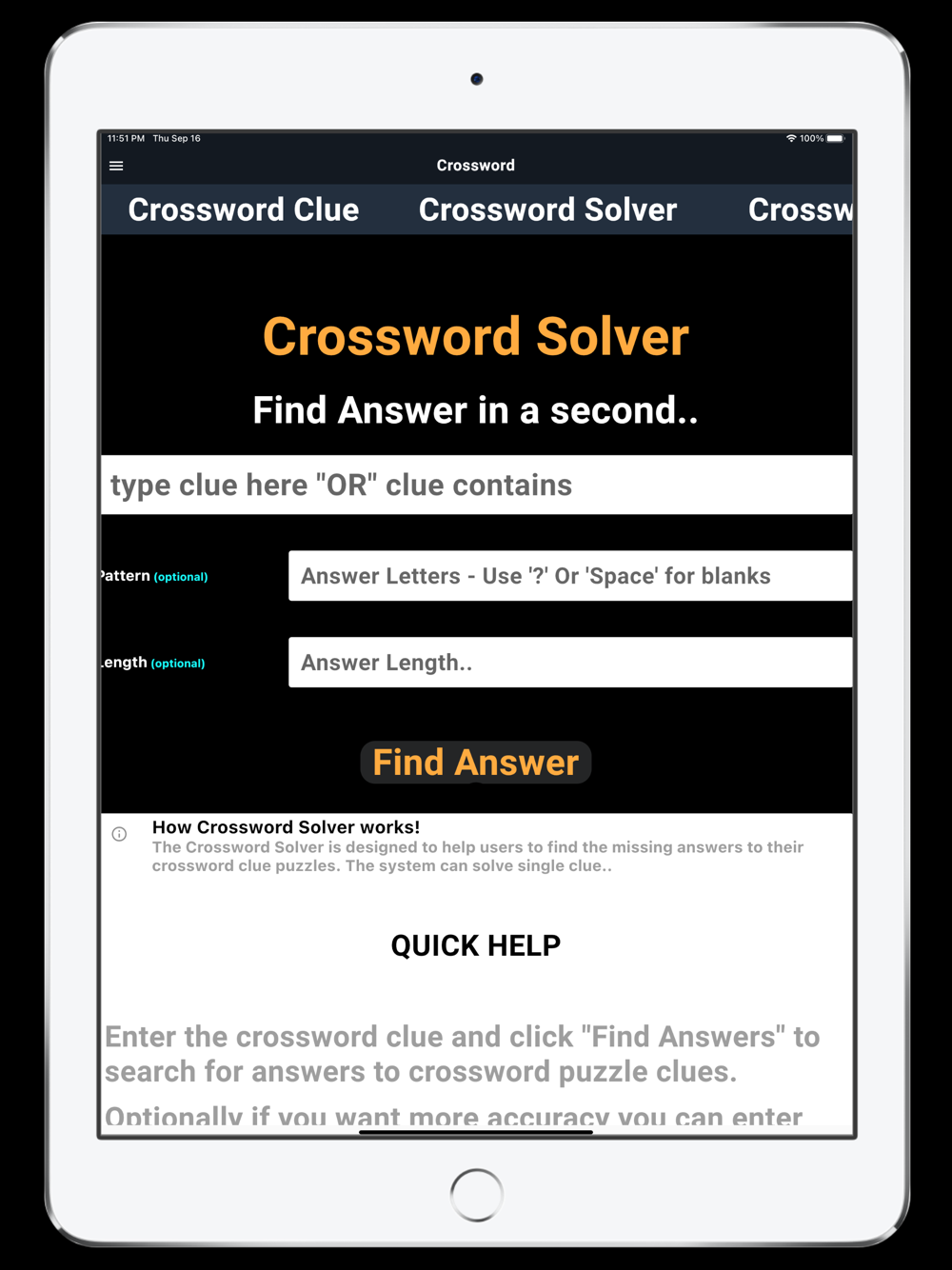 The Crossword Solver is designed to help users to find the missing answers to their crossword clue puzzles.