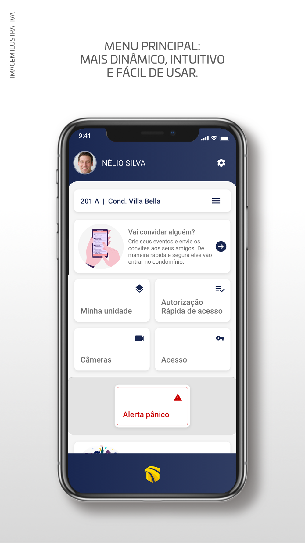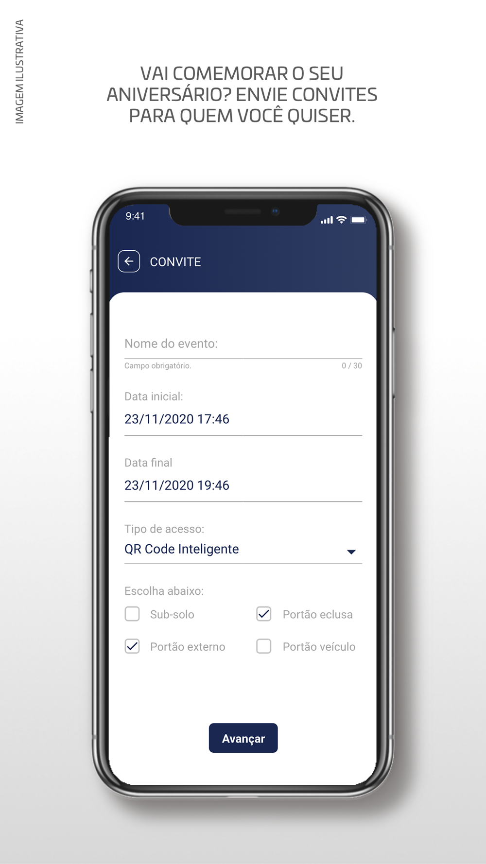 Possibilidade de o morador criar um evento e enviar convites para todos os seus convites. Sempre que um dos seus convidados entrar ao condomínio, ele receberá uma notificação push no app.