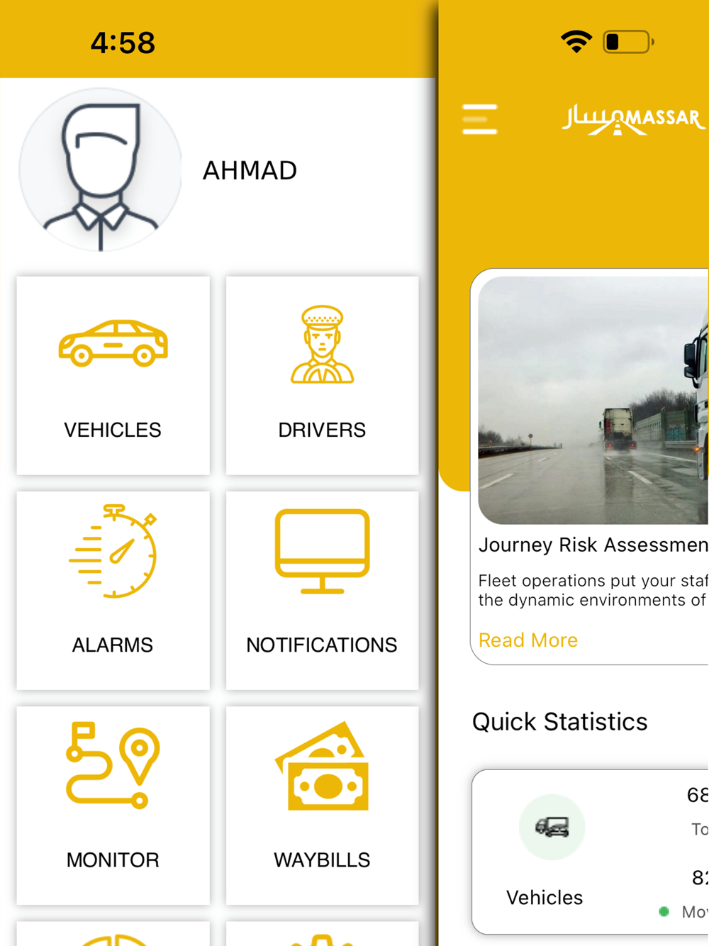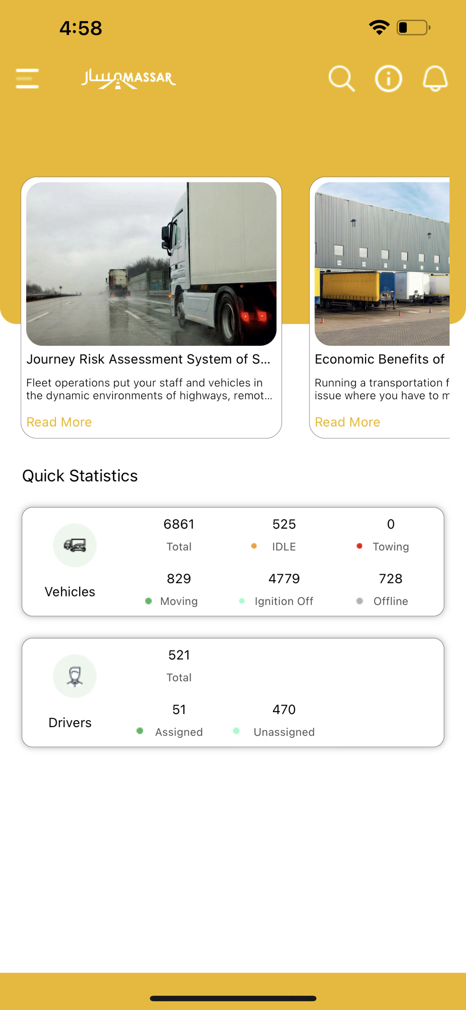 MassarTrack app is a fleet management platform that allows fleet admins to monitor, get notified, manage, and build profound reports about their assets. MassarTrack mobile application has come to increase the accessibility of users to their assets. The app lets the users to accomplish wide range of functionalities on their assets passively. They can build a subset of reports, monitor, and get notified through user-defined push notifications.