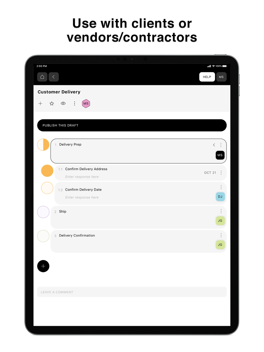 Share tasks with anyone, whether they have the app or not. This makes it great for things like guiding a potential client through a process of deciding to work with you, or coordinating a project with an outside consultant.