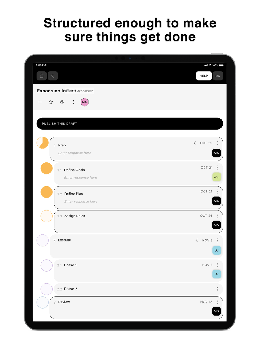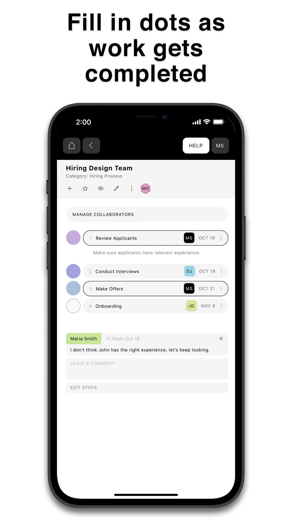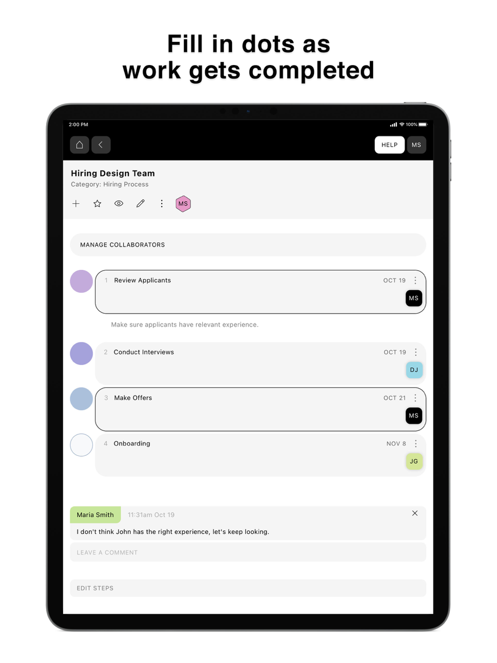 Dots represent steps in the process. As you fill in dots, collaborators get notified (if you wish).