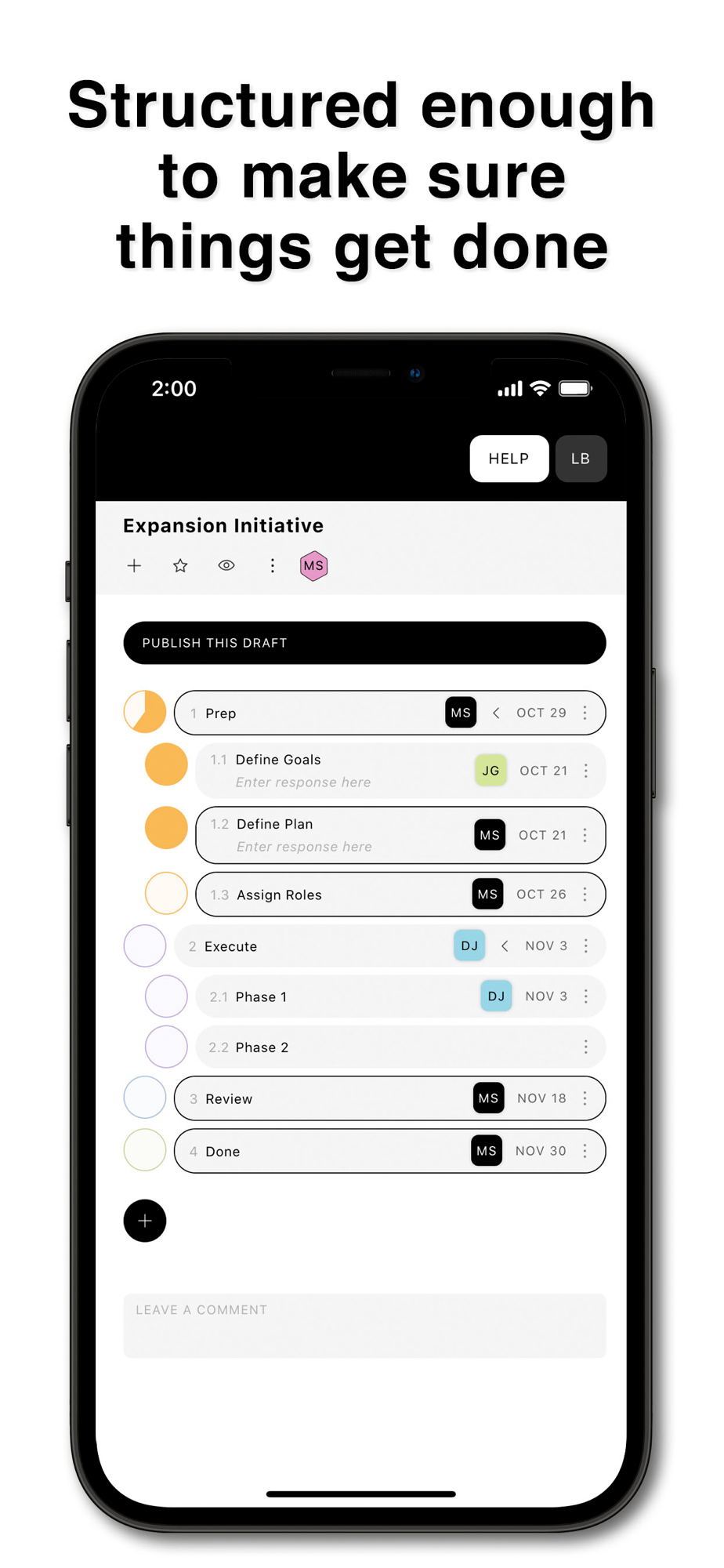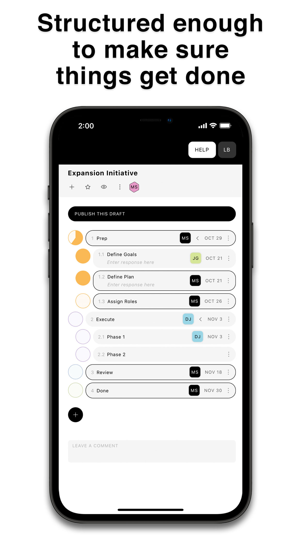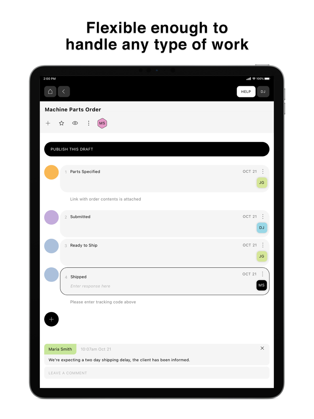 Dots represent steps in the process. As you fill in dots, collaborators get notified (if you wish).