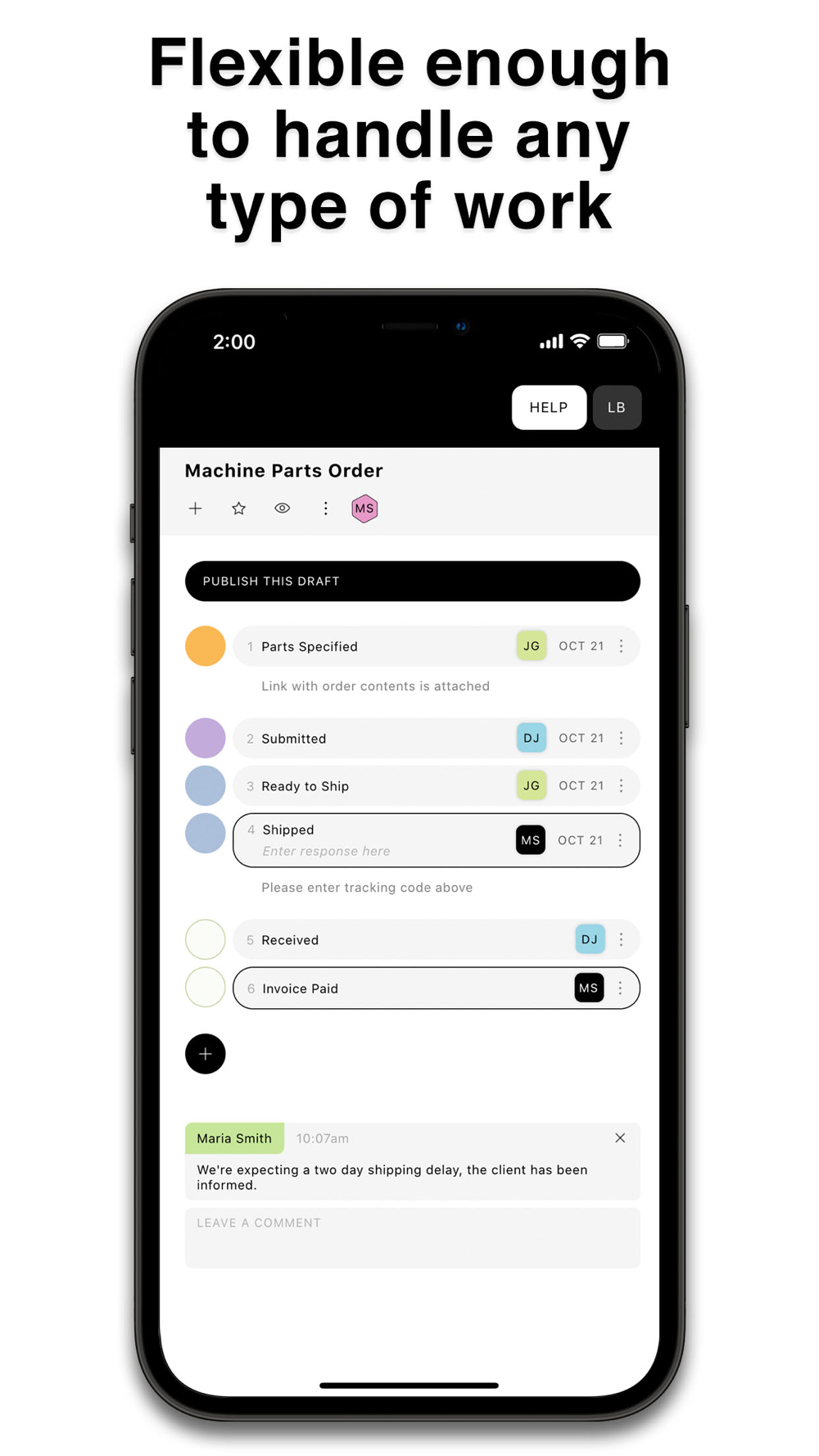 Polydot lets you give the amount of structure you need to a series of next steps. You just name dots that represent the steps, assign them, and then people click them when done. It notifies others on the team as you wish. If you want to standardize the steps in a recurring process all it takes is a single click.