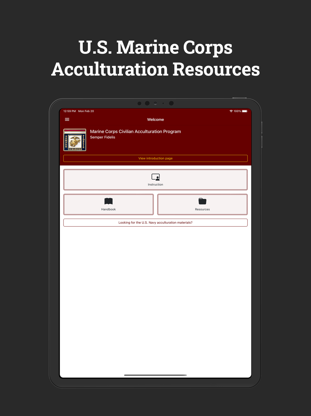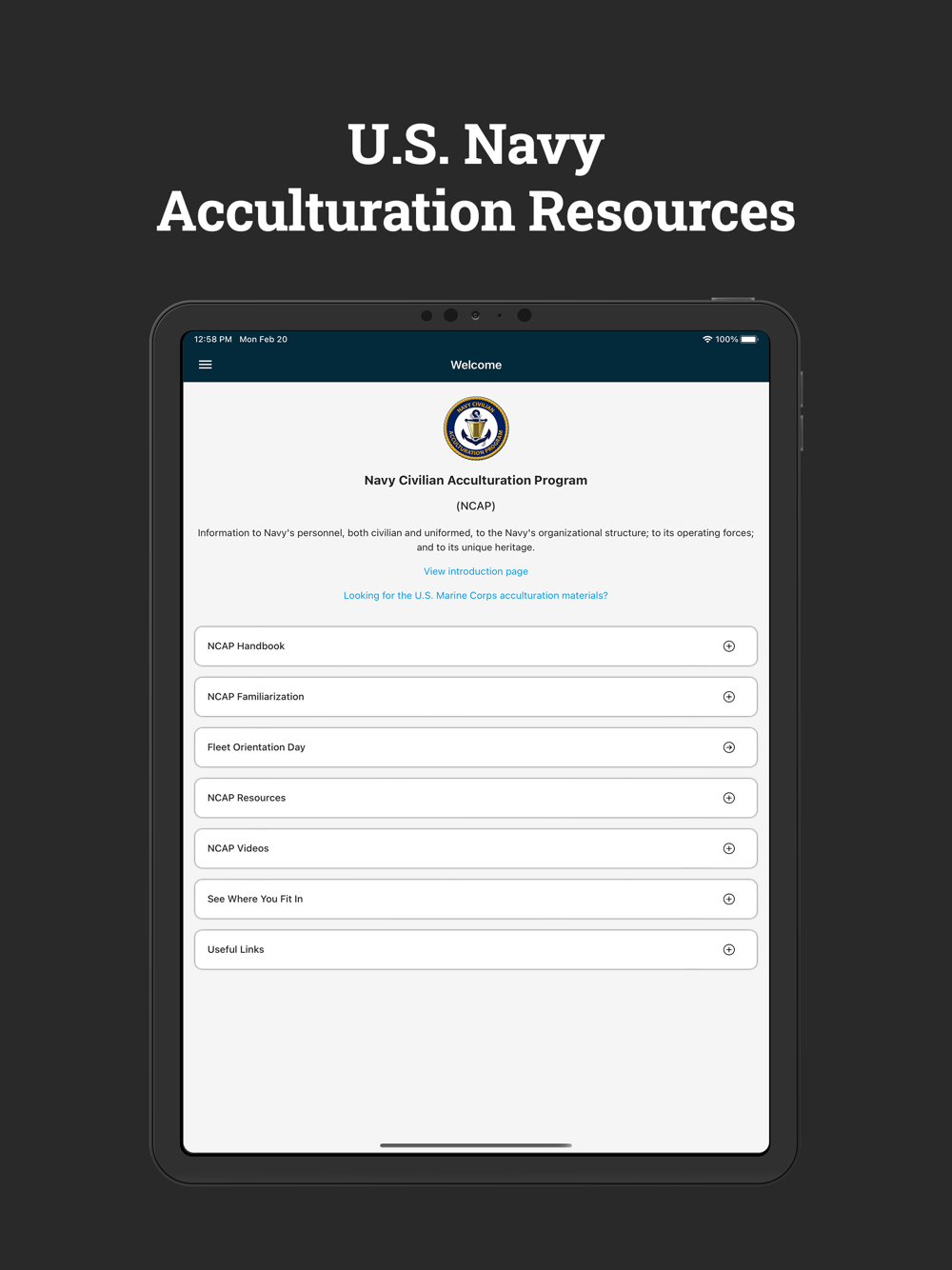 The Department of Navy Acculturation Program (DON AP) app, formerly known as the Navy Civilian Acculturation Program (NCAP) app, has been revised, expanded, and rebranded to include both Navy and Marine Corps content and capabilities. The app is an on-demand training, education, and orientation tool for new civilian employees of the U.S. Navy and the U.S. Marine Corps. It provides general information about the Navy and the Marines, including organizational structure, operations, uniformed and civilian personnel, history, and heritage.