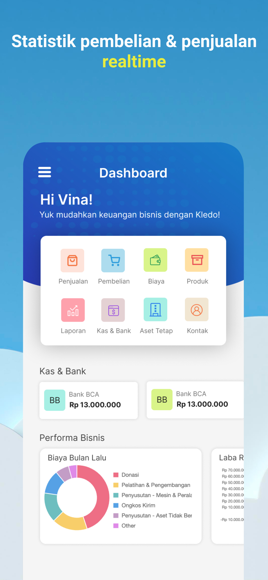 Download laporan keuangan dan pantau statistik penjualan harian, mingguan, bulanan, bahkan tahunan secara otomatis di Kledo. Dijamin rapi deh dan mudah dimengerti.