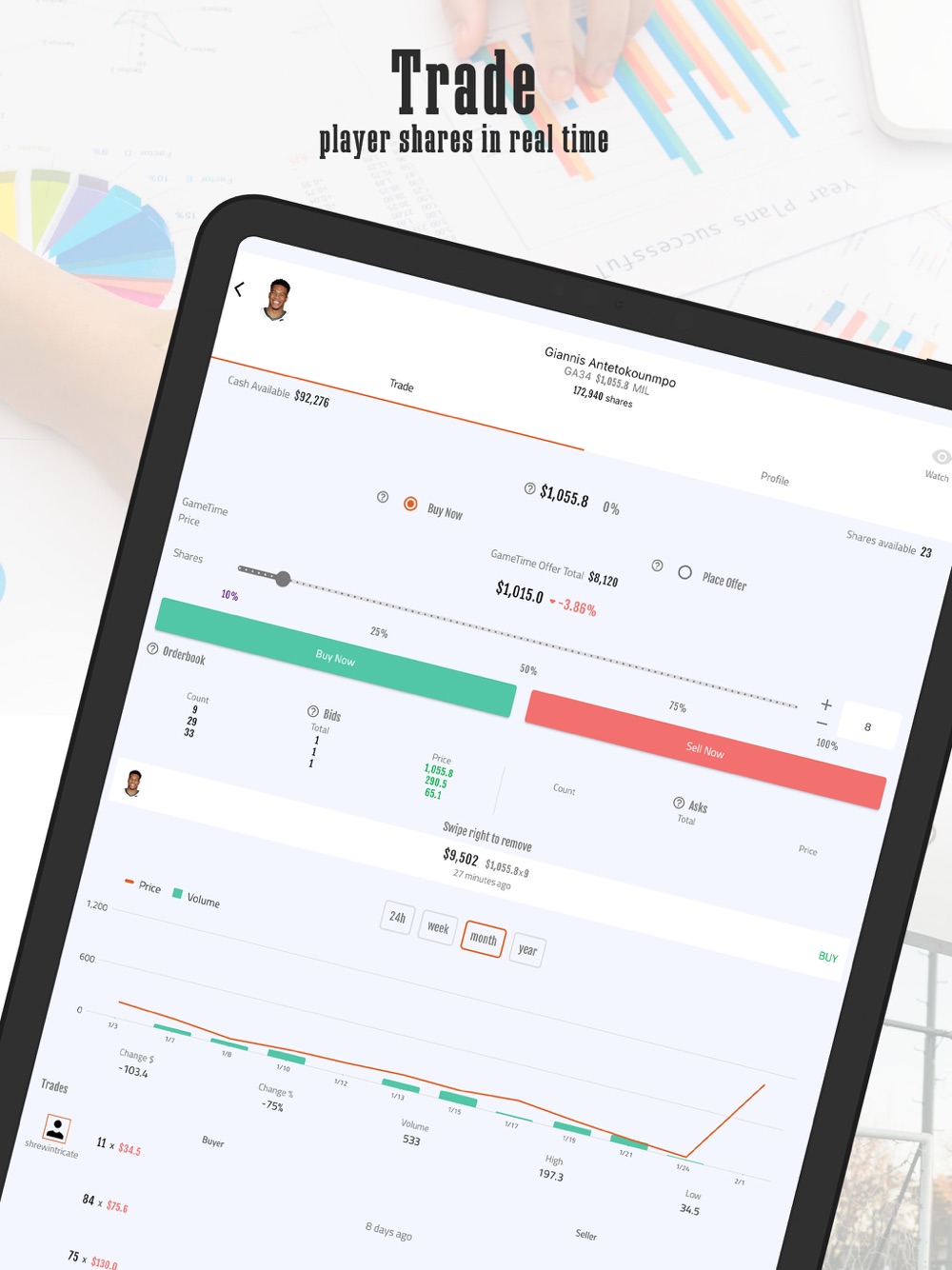 GameTime Market is a Fantasy sports platform based on a players stock-market. Each player is issued stock that can be bought and sold in real time. Upon installation you will receive $25,000 to trade in order to build your portfolio and start competing in custom fantasy contests immediately.