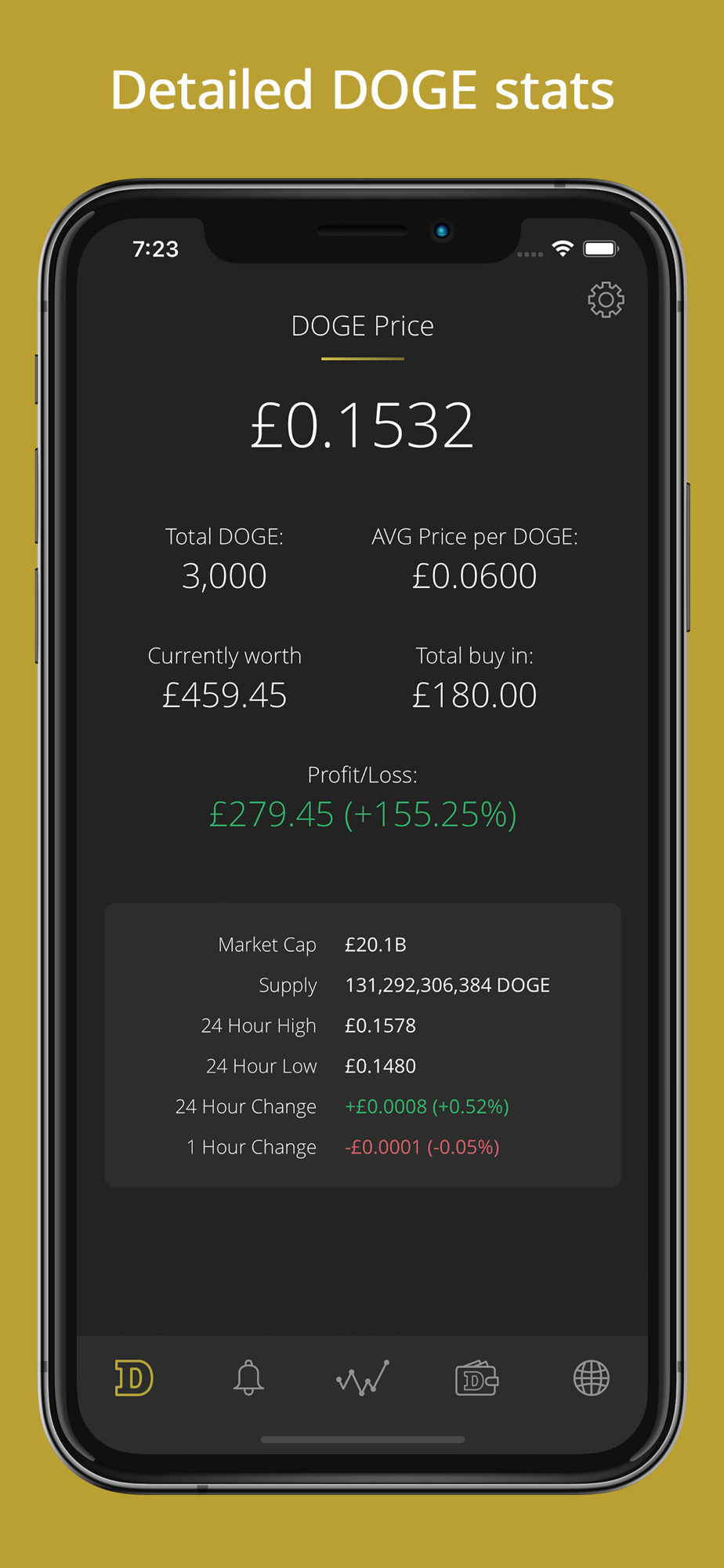 High/low DOGE Alerts (notifications), detailed stats, widgets, news, profit and loss stats and more.