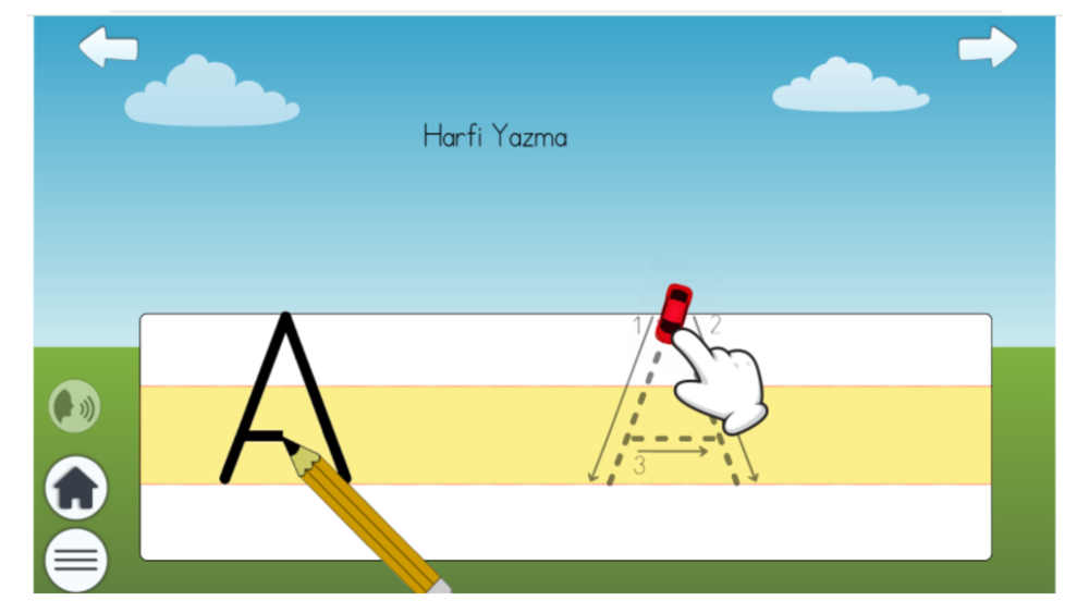 Yazma etkinliğinde sesin yazılışı animasyon ile gösterilir. İstenildiğinde kalem simgesine dokunarak ekrana yazılabilir. Bu etkinlikteki amaç: Öğrencinin sesin nasıl yazıldığını öğrenmesine yardımcı olmaktır.