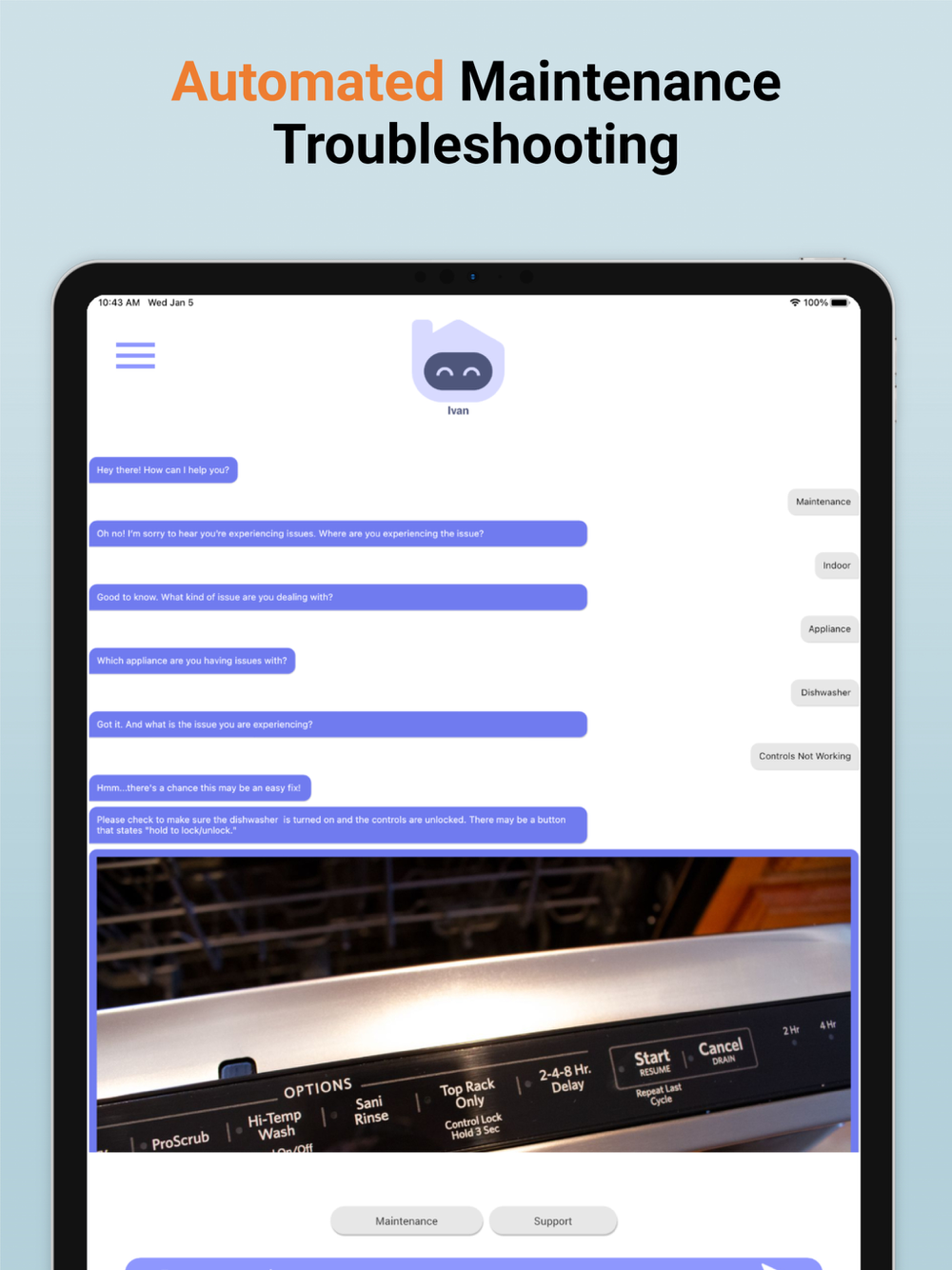 Whether routine or necessary, maintenance problems can generate considerable headaches for landlords and property managers. Ivan works around the clock to automatically diagnose and troubleshoot the matter and provide your tenants with a guide on how to resolve the issue. This will help you reduce unnecessary maintenance trips and charges! If Ivan is unable to solve the issue, your tenant will have the opportunity to submit a maintenance request. Ivan will let you know if they do!