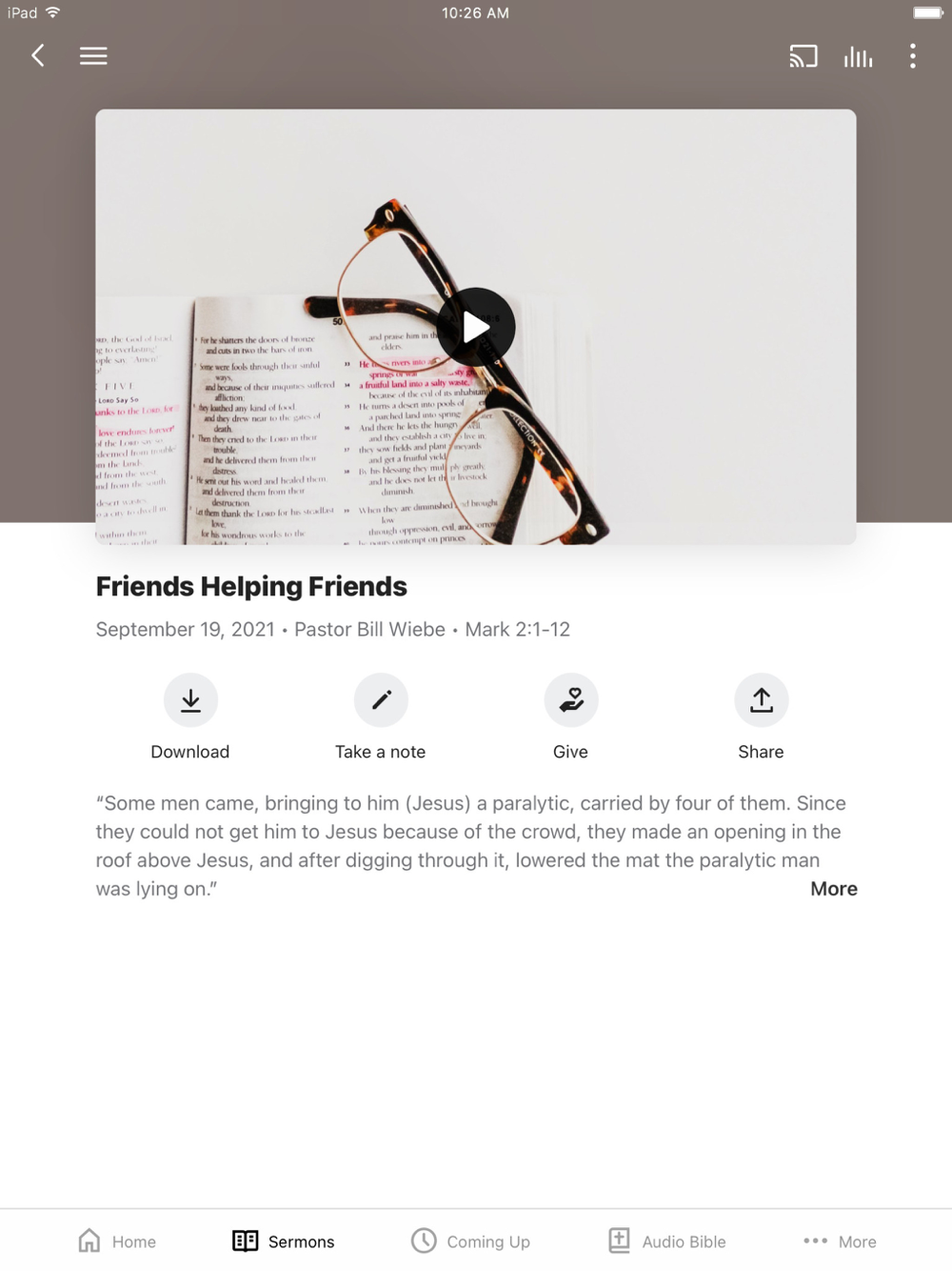 This app will help you stay connected with the day-to-day life of our church. With this app you can: watch or listen to past messages; stay up to date with push notifications; share your favorite messages via Twitter, Facebook, or email; and download messages for offline listening.