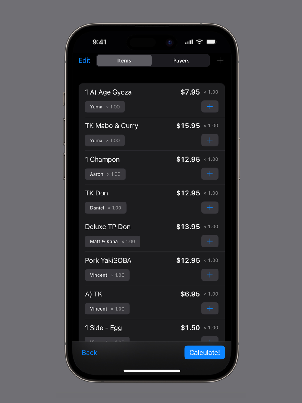 Easily split checks among friends, especially when taxes, tips, service charges, fees, coupons, and discounts are not included each item's price.
