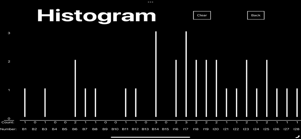 Bingo Numbers are easily generated and displayed in green. A list of past numbers is displayed in green and highlights the three previous numbers. Screens for a histogram and history of the numbers generated have been added which shows the bias towards a particular random number. Go B.I.N.G.O!