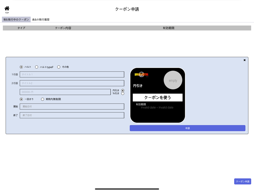 申請:クーポンの配信申請、ユーザーへ通知申請、トスアップ申請