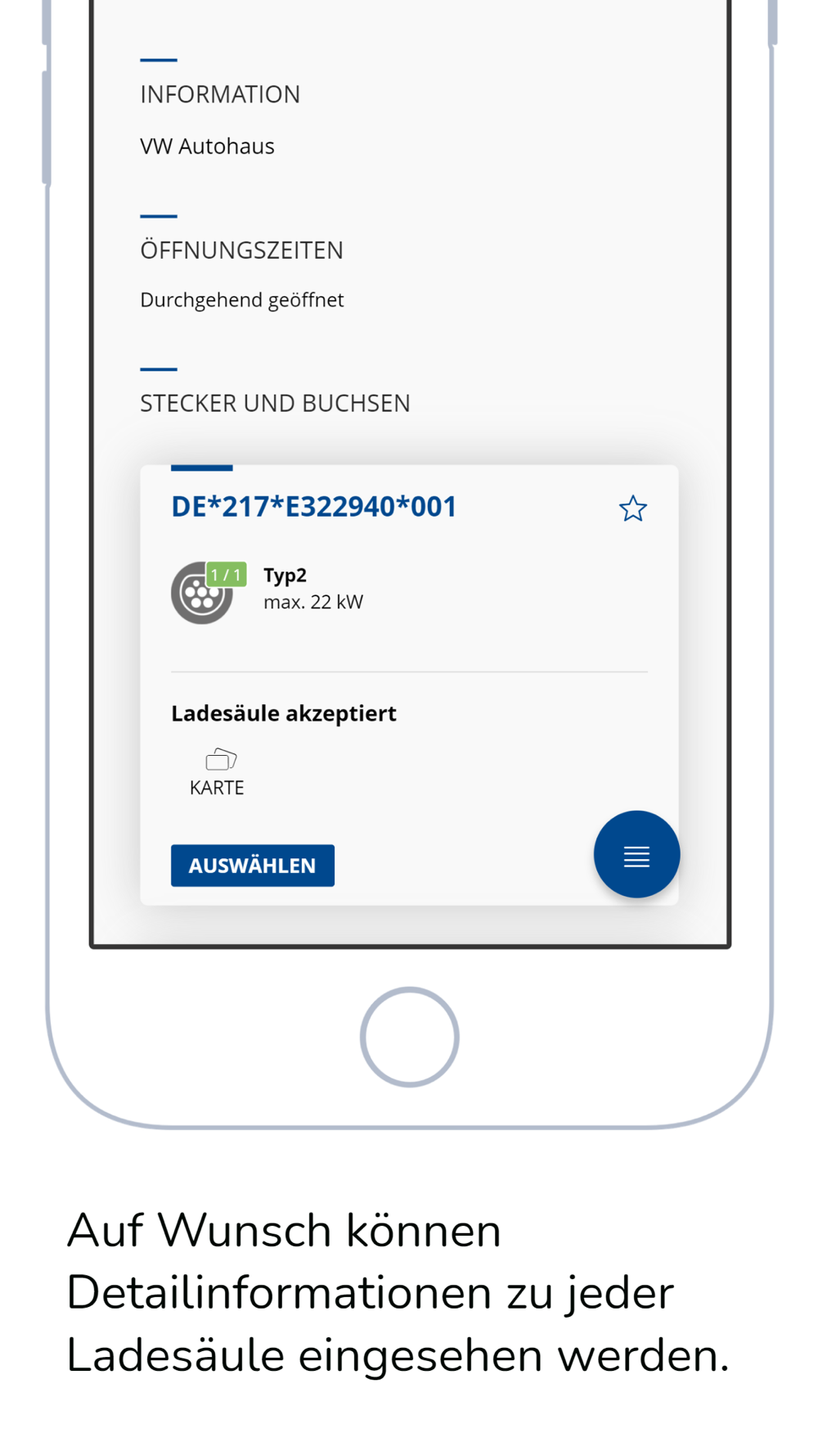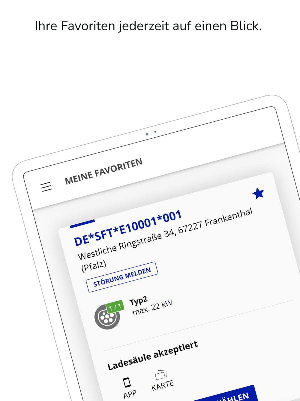 Unsere kostenlose Lade-App ermöglicht es Ihnen europaweit Ladevorgänge zu starten. Sie beinhaltet eine Übersichtskarte mit allen verzeichneten Ladepunkten der Stadtwerke Frankenthal und viele europaweiter Roamingpartner. Zu den mehr als 115.000 verfügbaren Ladepunkten werden die wichtigsten Informationen wie z.B. die aktuelle Verfügbarkeit, Nutzungsgebühren und der zu verwendende Steckertyp übersichtlich angezeigt. Mit der Navigations-Funktion kann der nächste verfügbare Ladepunkt immer schnell gefunden werden. Die Freischaltung des Ladepunkts erfolgt ebenfalls schnell und bequem über die App. Zusätzlich sind Abrechnungsinformationen inklusive Strombezug und Kosten für laufende sowie bereits beendete Ladevorgänge ersichtlich. Sollten Sie es bevorzugen unterwegs eine RFID-Karte zu verwenden, können Sie diese einfach in der App bestellen.