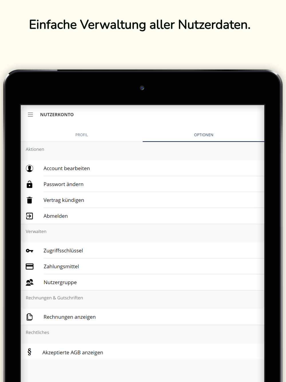 Auch persönliche Daten und Abrechnungsinformationen lassen sich einfach direkt in der App verwalten. Über Ihr persönliches Nutzerkonto können Sie Ihre aktuellen und abgeschlossenen Ladevorgänge einsehen. Die Abrechnung erfolgt bequem über Lastschriftverfahren oder Kreditkarte.