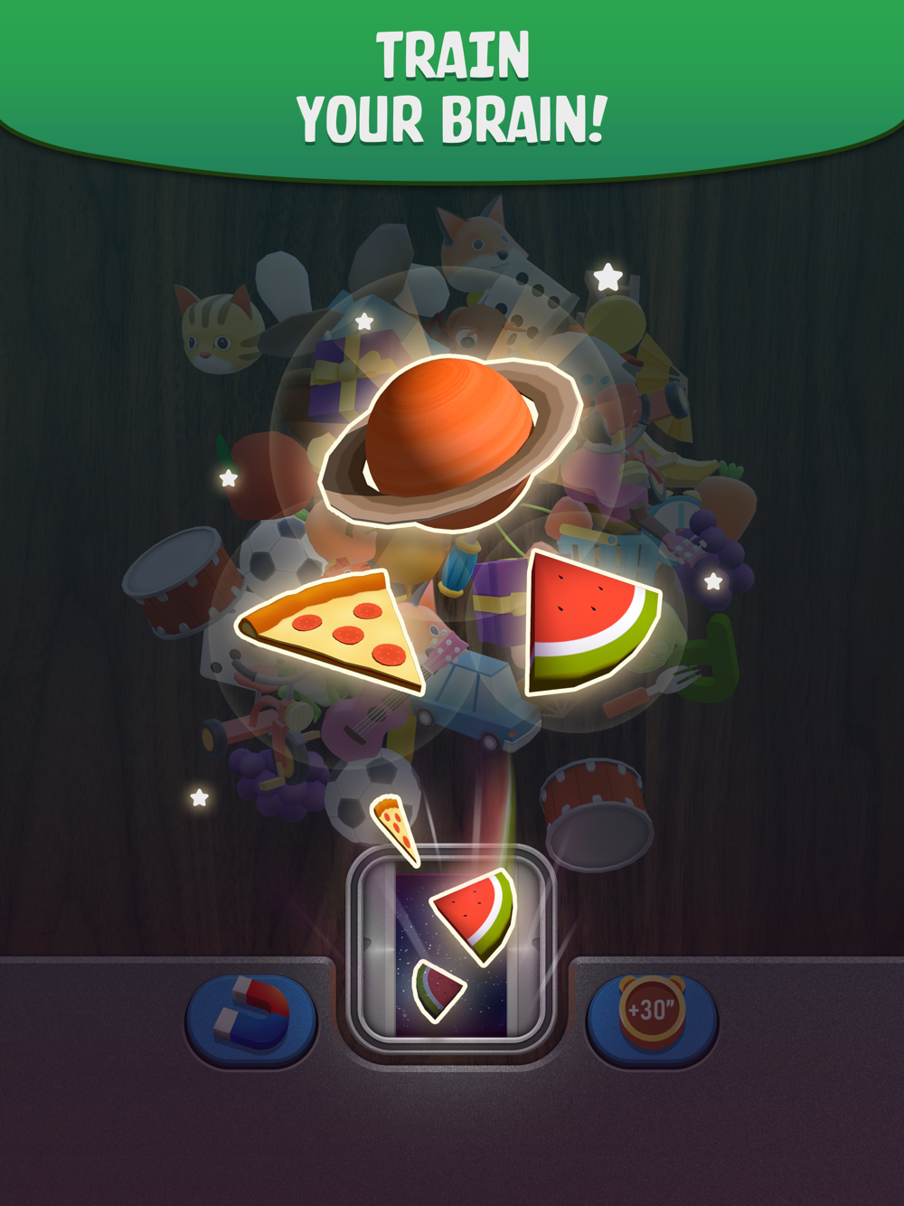 ◈ Just tap to place the 3D objects into the box. Two same objects will be collected.
