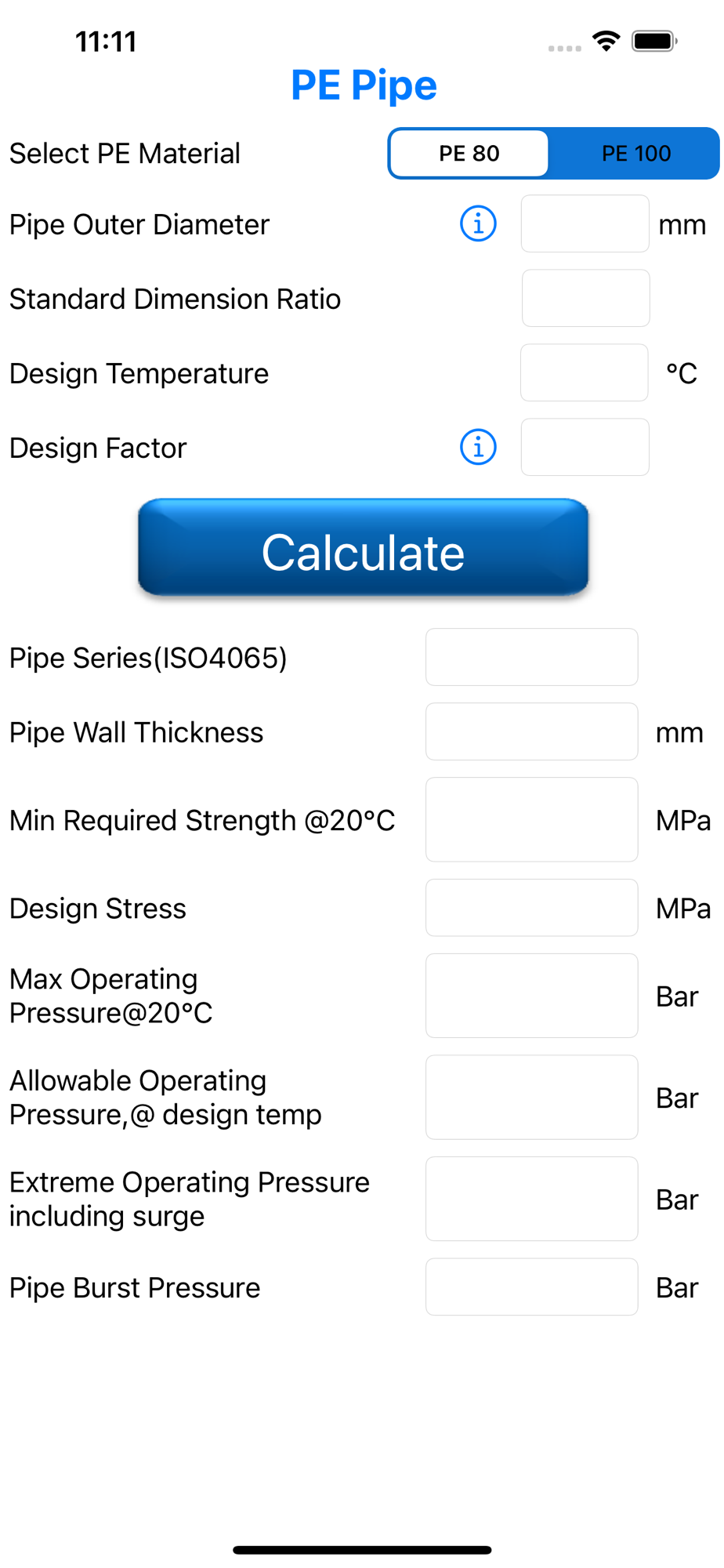 PE Pipe is a handy tool to evaluate the Polyethylene (PE) pipe material design properties based on pipe material class, temperature, pipe diameter and SDR selection. The tool helps in selecting the right pipe class (SDR) based on required design conditions such as temperature, required hydraulic pressure and area of application (i.e. water pipeline, sub-marine pipeline, gas pipeline).