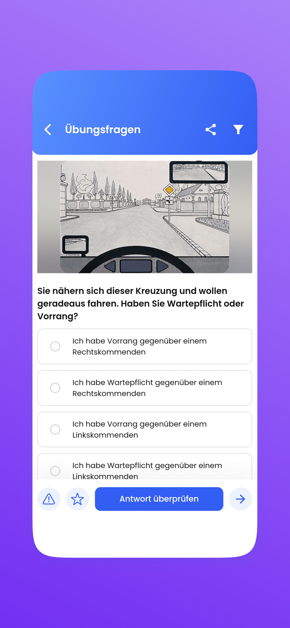 Mit unserer Führerschein App wird das Lernen für den Führerscheintest 2021 zum Kinderspiel. Unsere Führerscheinvorbereitung App hilft Ihnen dabei, sich optimal auf die Fragen des österreichischen Theorietests vorzubereiten und die Führerscheinprüfung im ersten Anlauf zu bestehen. In zufälliger Auswahl können Sie den gesamten Fragenkatalog durcharbeiten und anschließend unseren Übungstest für den Führerschein unter realen Bedingungen durchführen. Ein Countdown stoppt die Zeit, während Sie die Fragen aus dem offiziellen Führerschein-Fragenkatalog 2021 beantworten. In der App können Sie den Übungstest unbegrenzt wiederholen und jederzeit auf vergangene Tests zugreifen, um zu sehen, wo noch Verbesserungsbedarf besteht. Zusätzlich zu den Theoriefragen können Sie mit unserer Führerschein App die Bedeutung sämtlicher österreichischer Verkehrsschilder lernen, die der Übersichtlichkeit halber nach Kategorien sortiert sind. Wenn Sie zusätzlichen Lernbedarf haben, dann wechseln Sie zur Pro-Version unserer App und nehmen Soe an unseren Führerschein Videokursen teil, die Sie sicher und verständlich durch sämtliches Lernmaterial führen – die beste Hilfe, um ihren Theorietest 2021 zu bestehen.