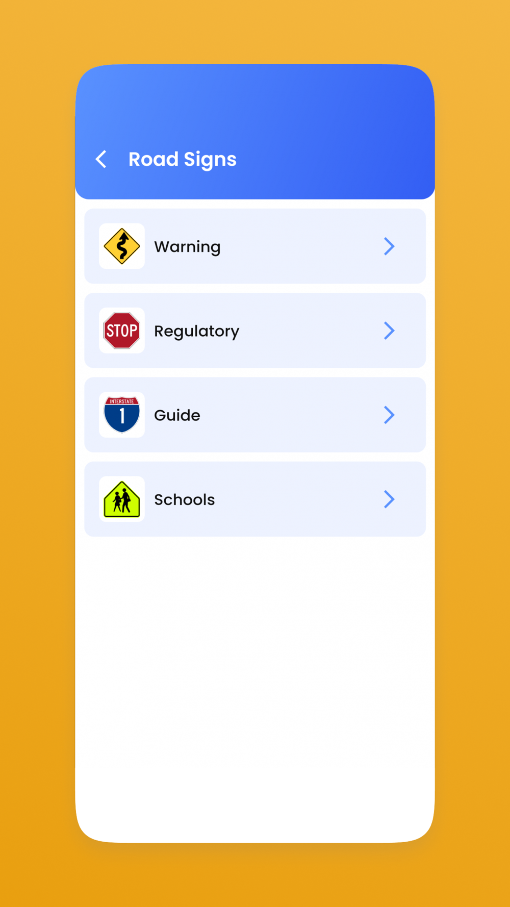 3. Road Signs – a full list of all relevant road signs, by categories.