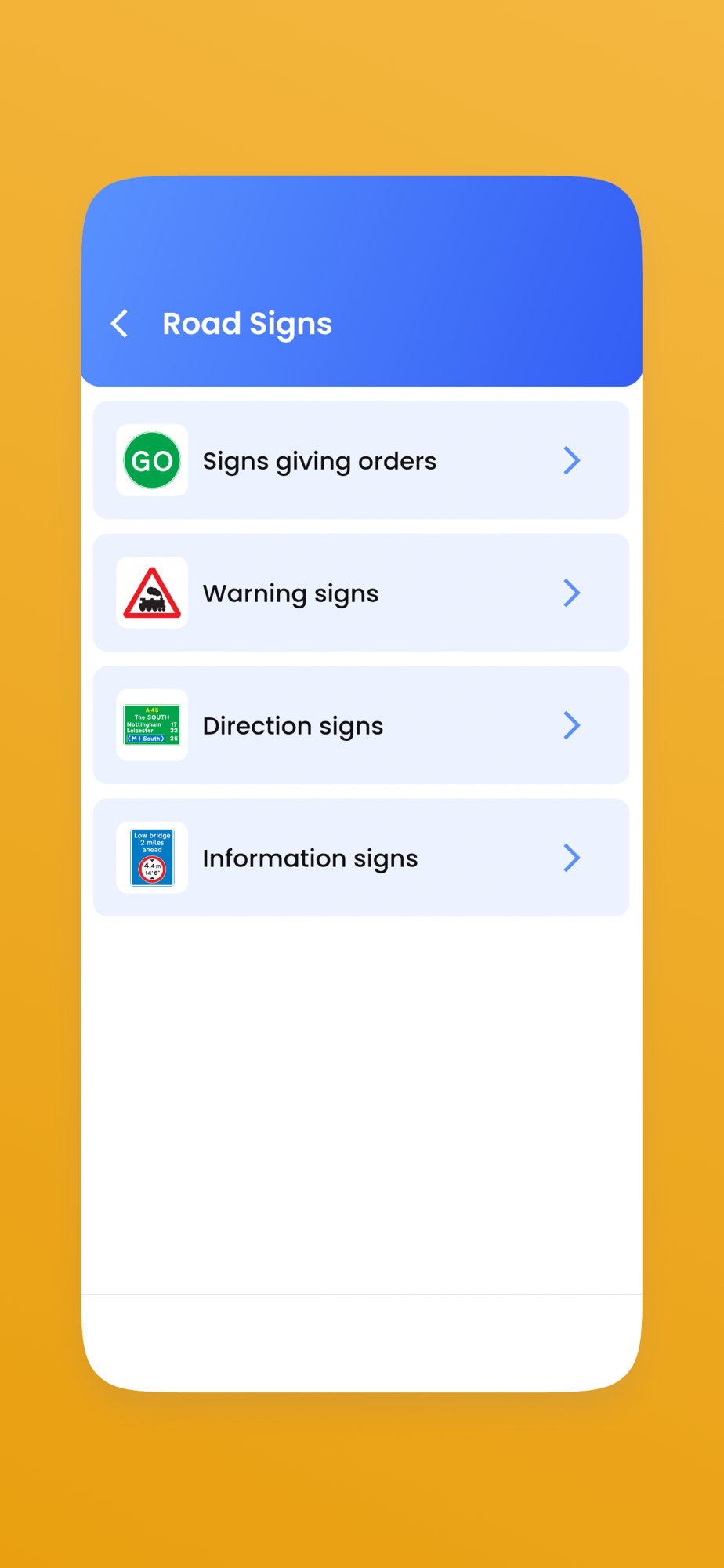3. Road Signs – a full list of all relevant road signs, by category.