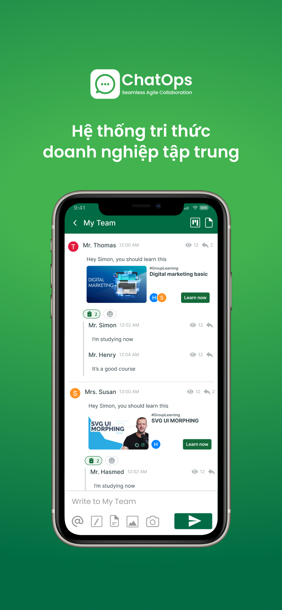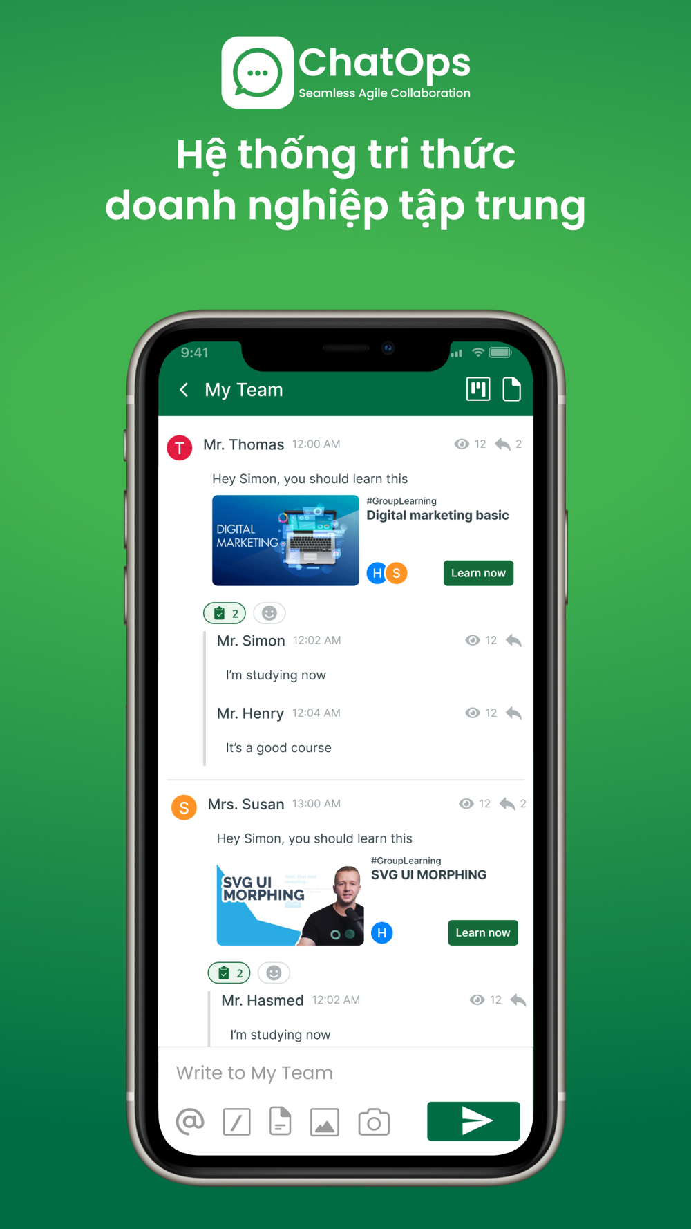 ChatOps - nền tảng cộng tác giao tiếp liền mạch hàng đầu doanh nghiệp, là không gian làm việc số. ChatOps cung cấp đầy đủ các tính năng giao tiếp giúp cho việc cộng tác công việc trở nên liền mạch, linh hoạt, đúng thông tin vào đúng kênh công việc, đúng người vào đúng thời điểm. Nền tảng thúc đẩy cộng tác giữa người-người và người-máy ứng dụng sâu AI và Machine Learning nhằm tăng cường tự động hoá, thông minh hoá công việc hướng đến việc khai thác dữ liệu phục vụ quá trình ra quyết định nhanh chóng. ChatOps cung cấp 4 tính năng chính: