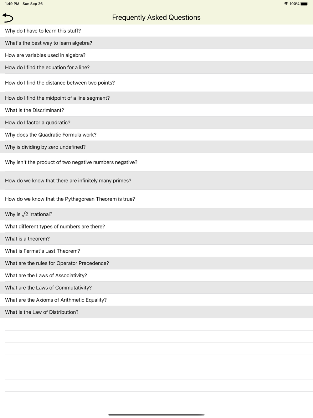 Lots of useful information is included in the FAQ section of the app, which includes articles such as "Why Do I Have to Learn This Stuff?" and "What's the Best Way to Learn Algebra?"