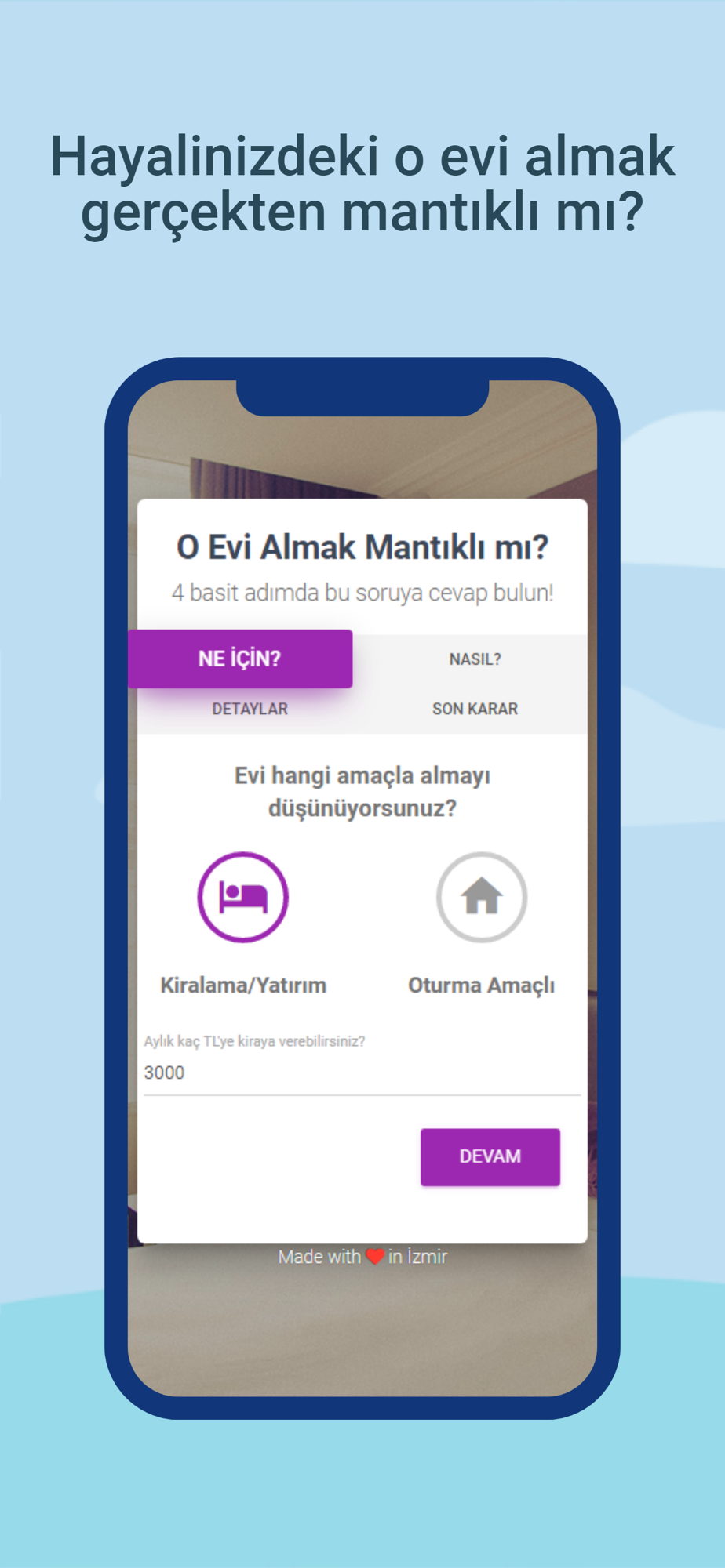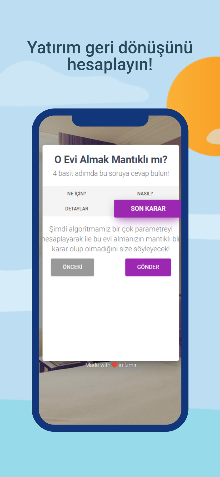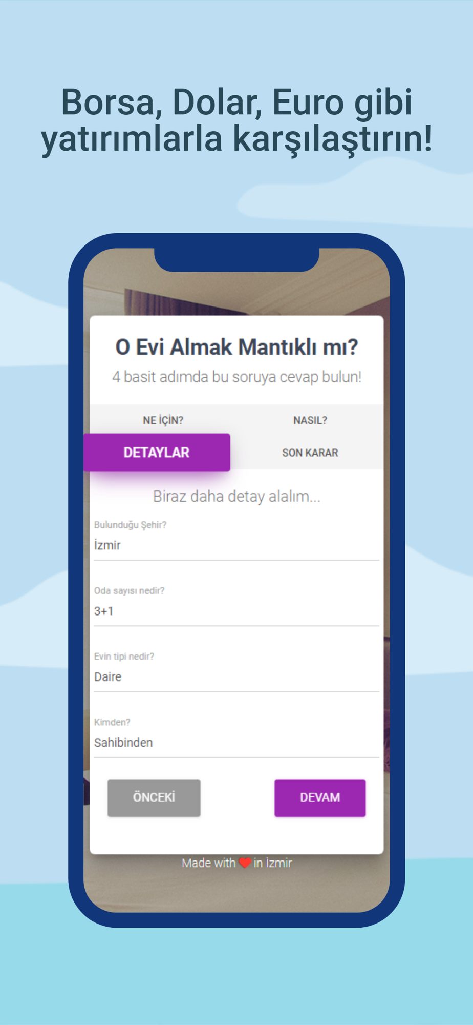 Bu uygulama, almaya karar verdiğiniz evi, diğer yatırım araçları ile karşılaştırarak size detaylı bir analiz sunar. Siz sadece almayı düşündüğünüz ya da almaya kara verdiğiniz eve dair bir kaç basit bilgi girersiniz ve kalan her şeyi uygulama halleder. Almayı düşündüğünüz evi geçmiş 15 seneki performansına göre:
