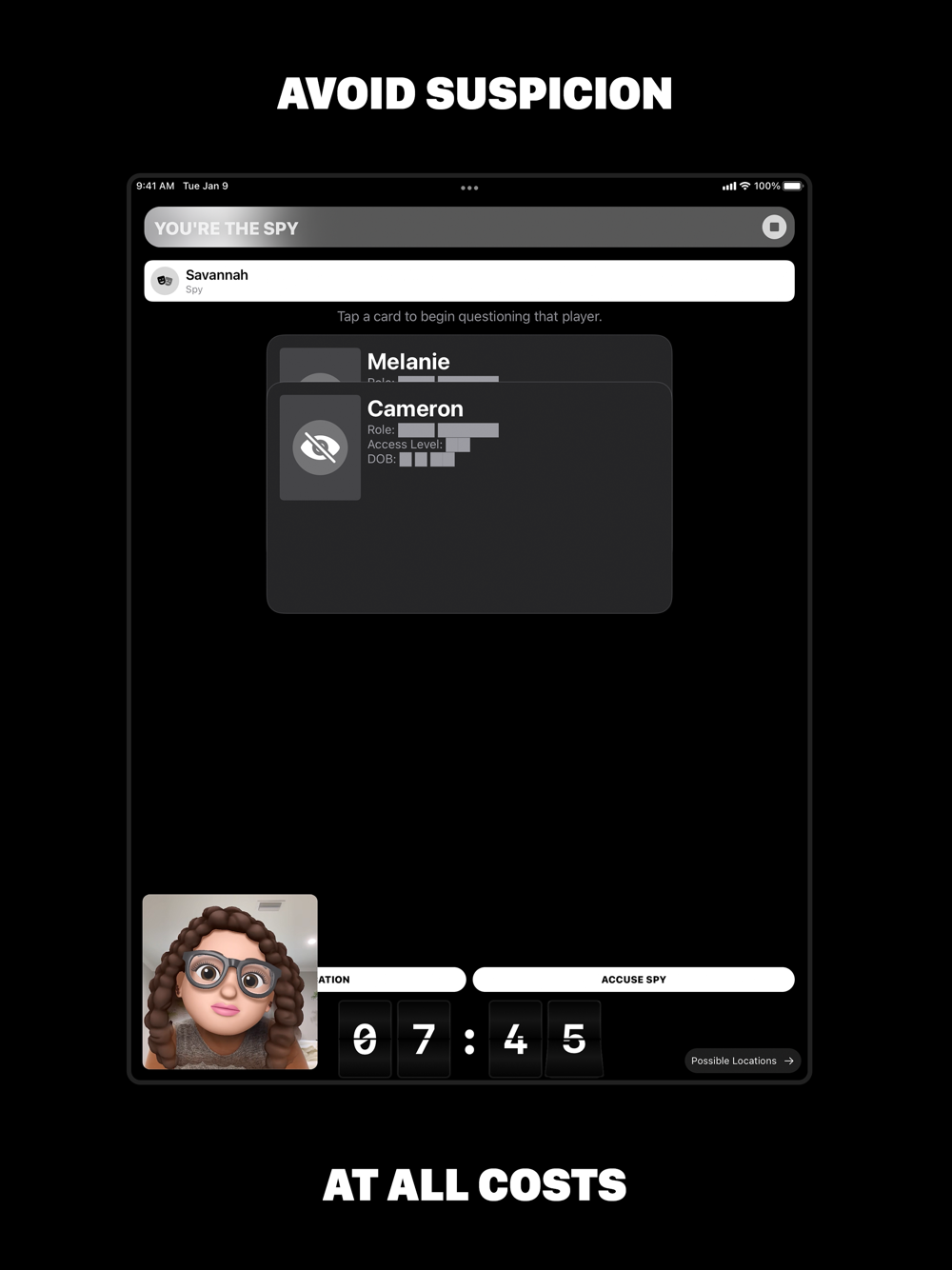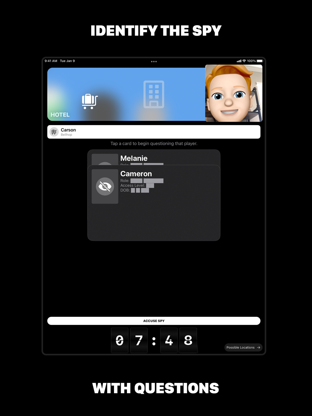 Except for the spy! You must deduce who the spy is through a series of questions, while the spy tries to identify the location.