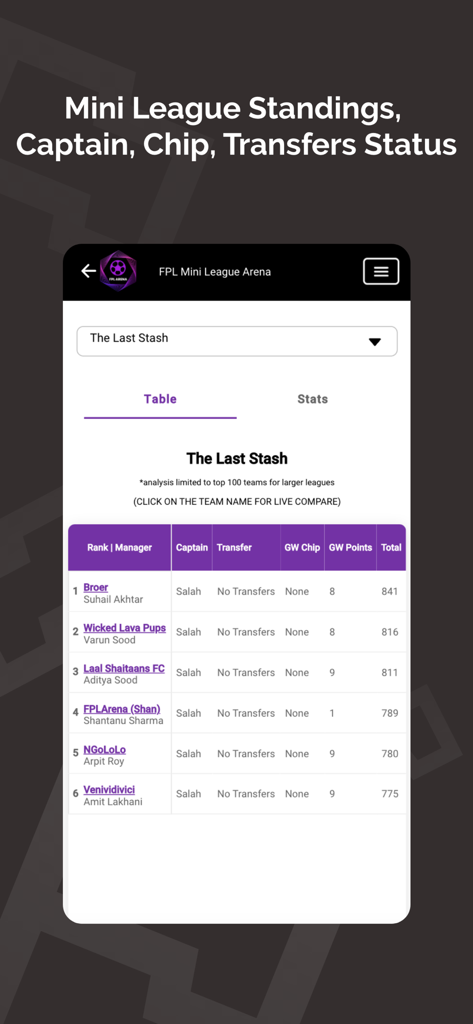 • Extended leaderboard table with Chip used, transfers, high low scores of individual managers