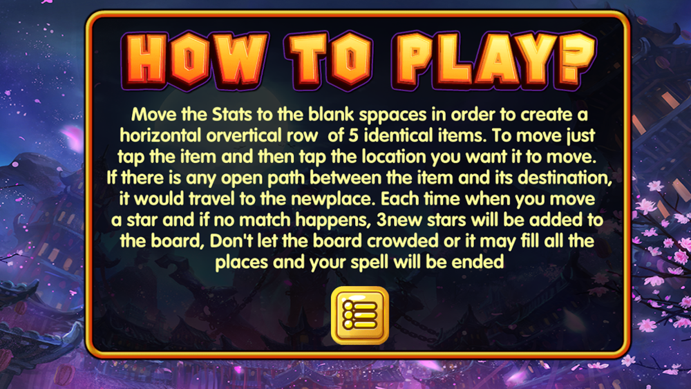 Move the Stars to the blank sppaces in order to create a horizontal orvertical row of 5 identical items.To move just tap the item and then tap the location you want it to move. If there is any open path between the item and its destination,it would travel to the newplace.Each time when you move a star and if no match happens,3new stars will be added to the board,Don't let the board crowded or it may fill all the places and your spell will be ended.