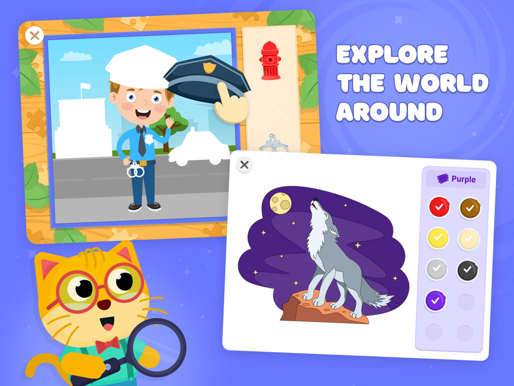 Your kid will learn to recognize shapes and sizes, colors, textures, as well as fruits and vegetables. The app will also help to develop good hygiene habits – Mike the cat will teach your child to brush their teeth, take a shower and go to bed on time. Moreover, the game will boost children's attention, motor skills, and common sense.