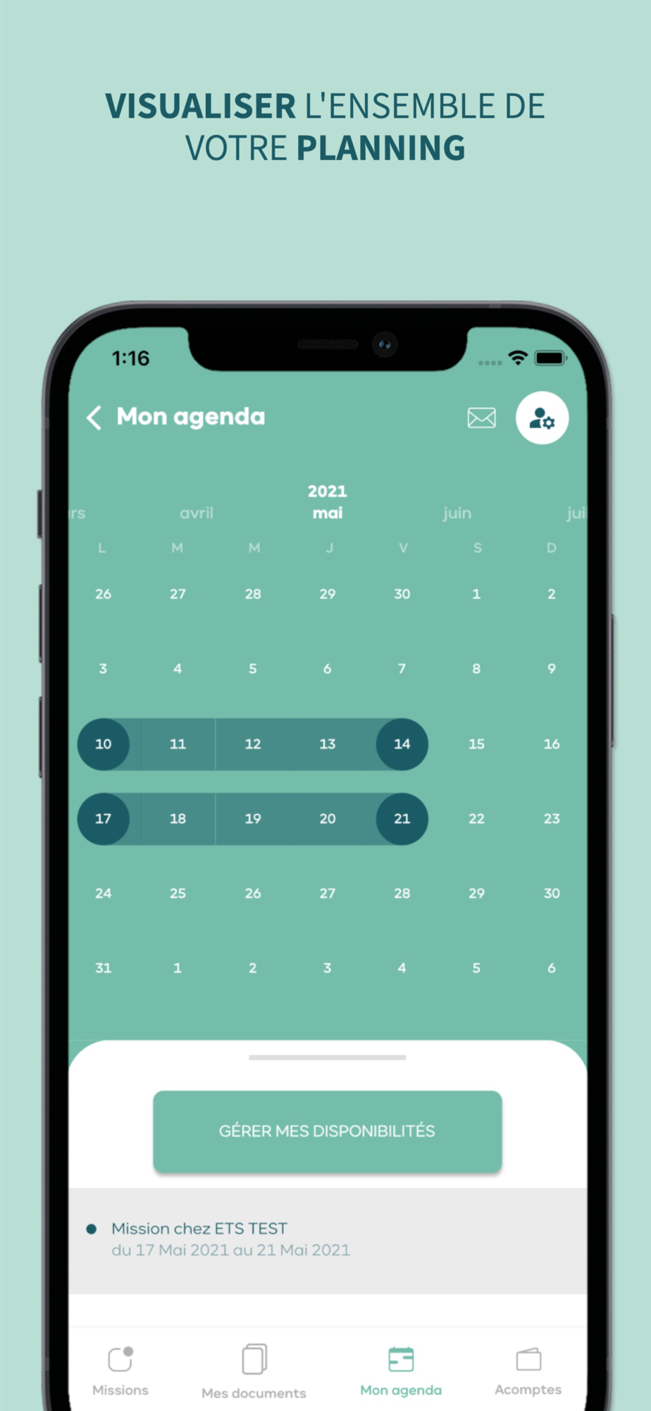 • Retrouver l'ensemble des missions qui vous sont confiées dans votre planning, indiquer vos disponibilités ou indisponibilités,