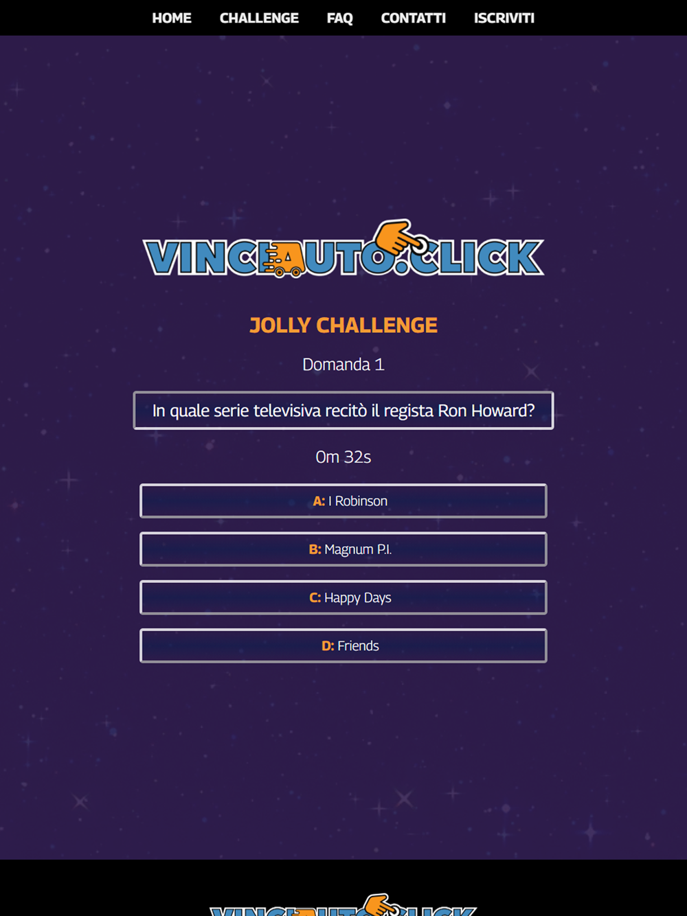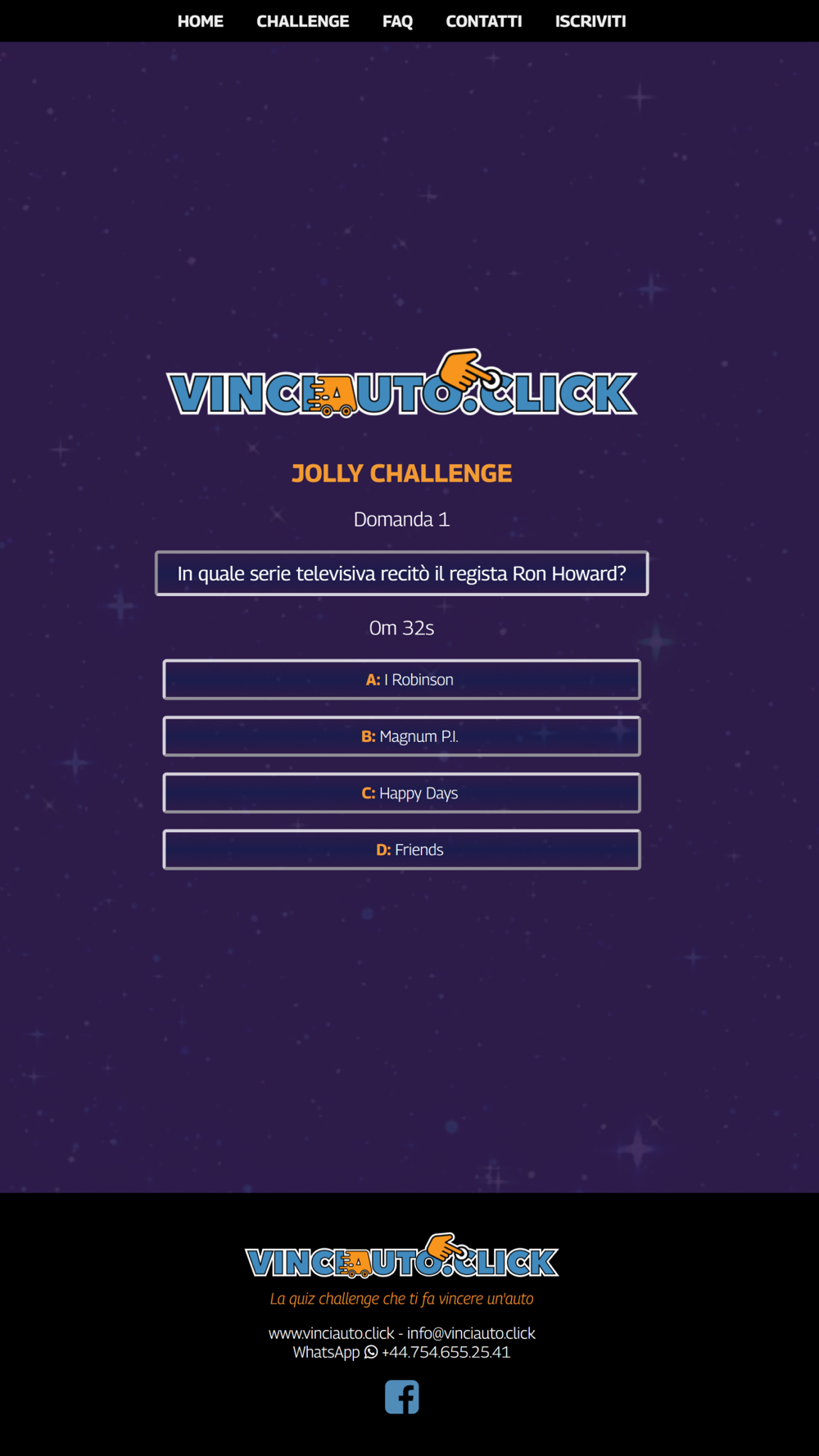 Vincere un'auto non è mai stato così semplice! Devi solo divertirti con i nostri quiz e scalare la classifica! Resta connesso per non perderti l'inizio delle sfide e per ricevere il tuo bonus di benvenuto!