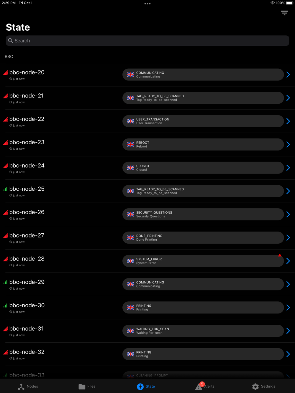 The app shows online status, alarm messages and their current state. You can capture the screen of a device and see exactly the same picture as the passenger. Software updates can also be performed remotely.