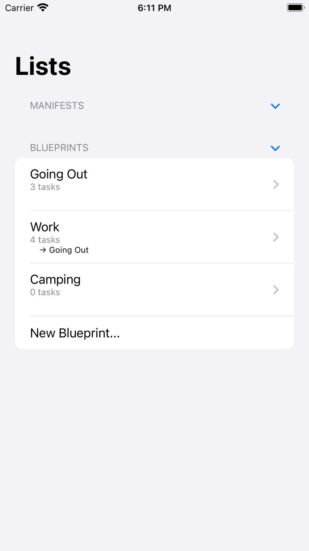 Listomania won't let you create a blueprint from a manifest, because that's the wrong way around -- You create a manifest from a blueprint.