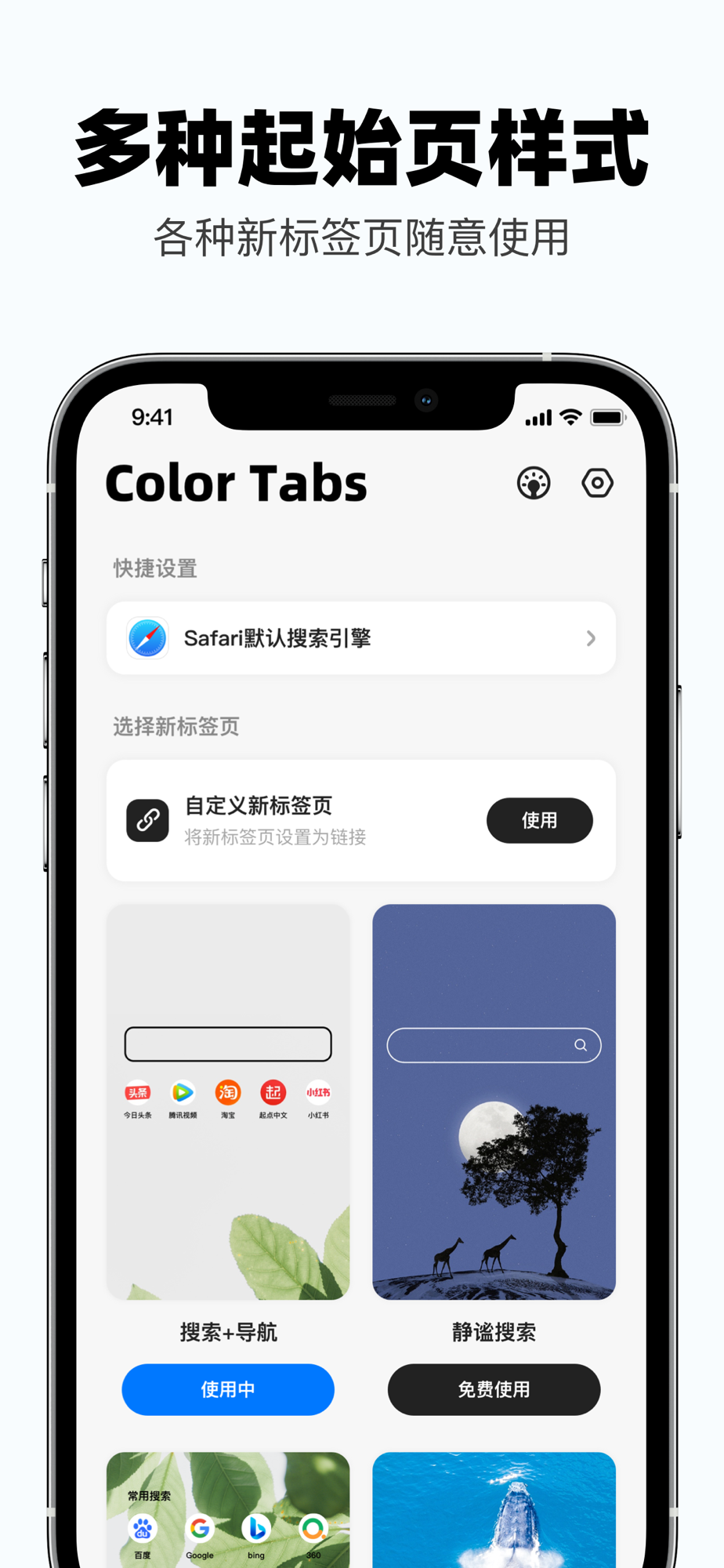 除了超高的颜值,Color Tabs也拥有不俗的实力,支持自定义设置网址为起始页,启动Safari一键直达目标页面,多种搜索引擎随意使用,不同类型网址导航一目了然。